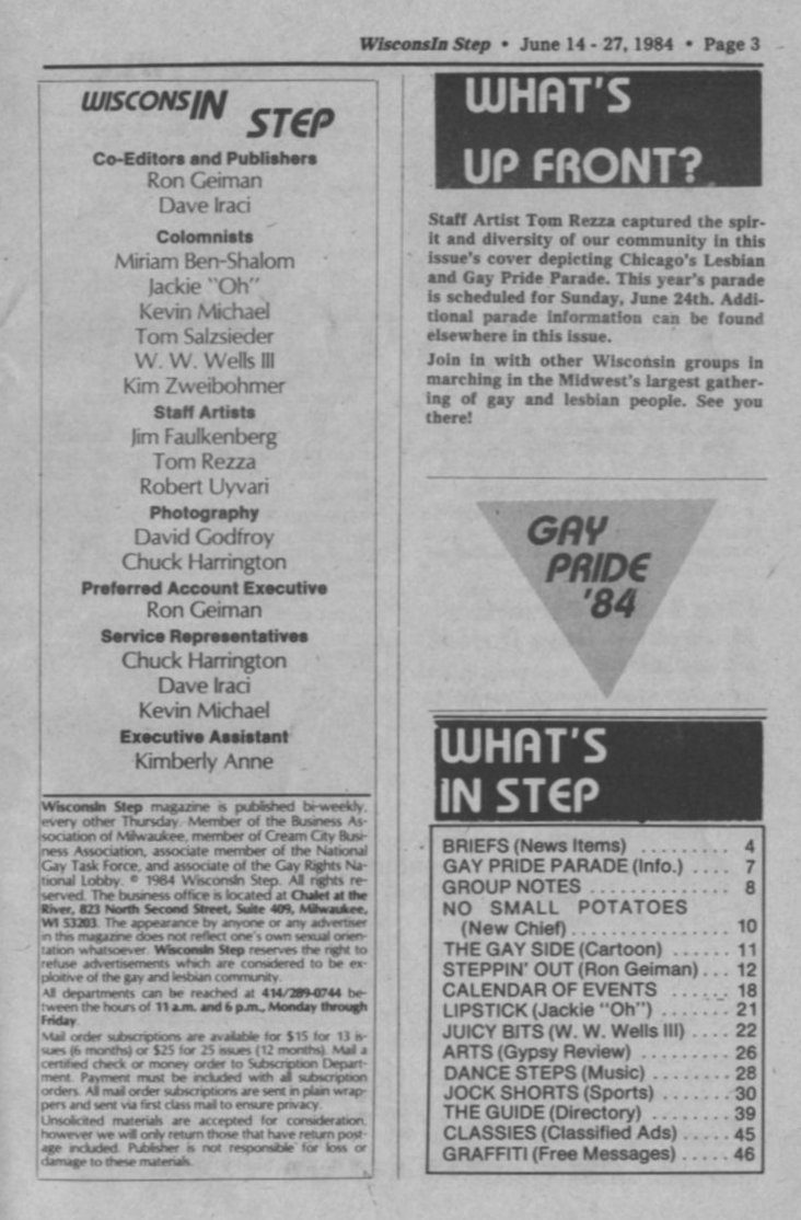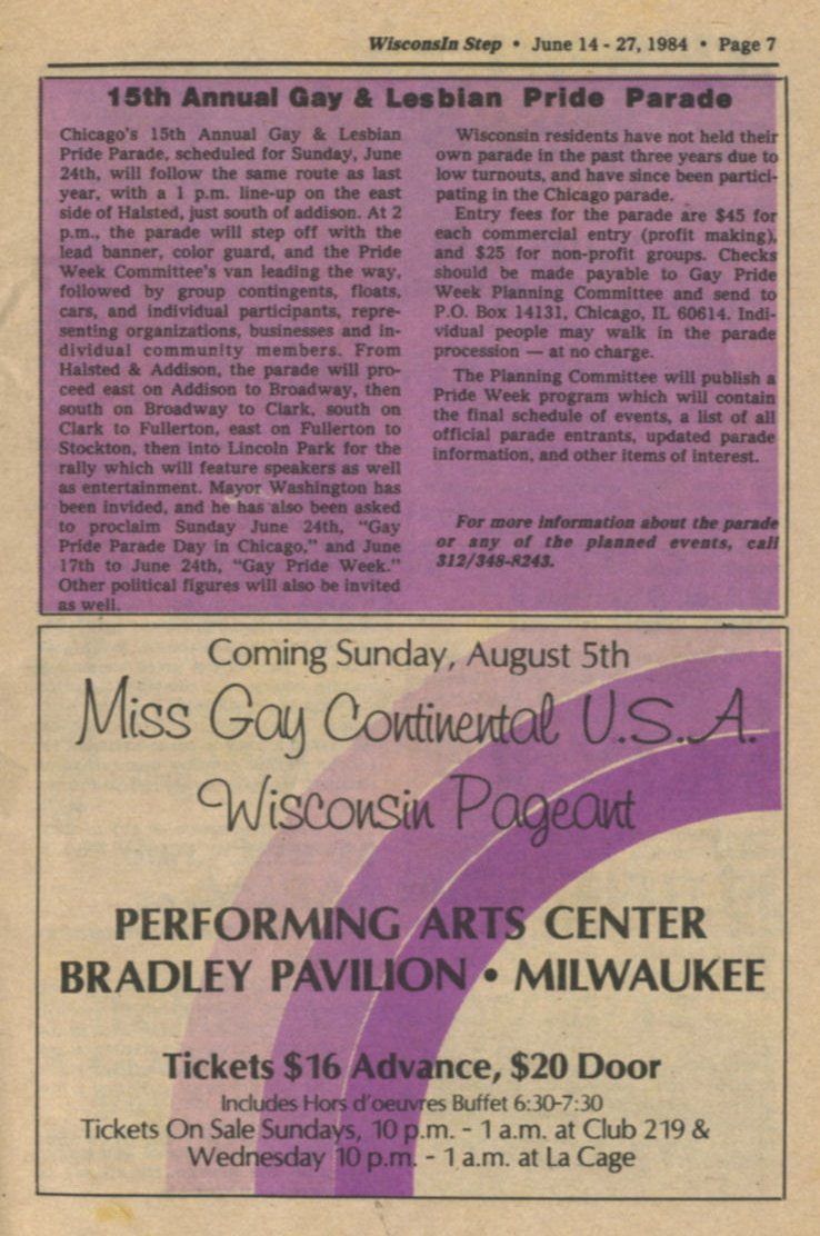Chicago's 15th annual Pride Parade; + Ad: Miss Gay Continental USA Wisconsin Pageant