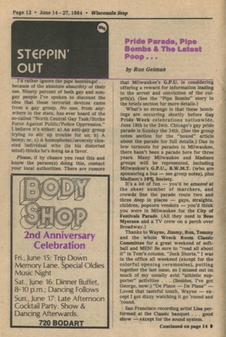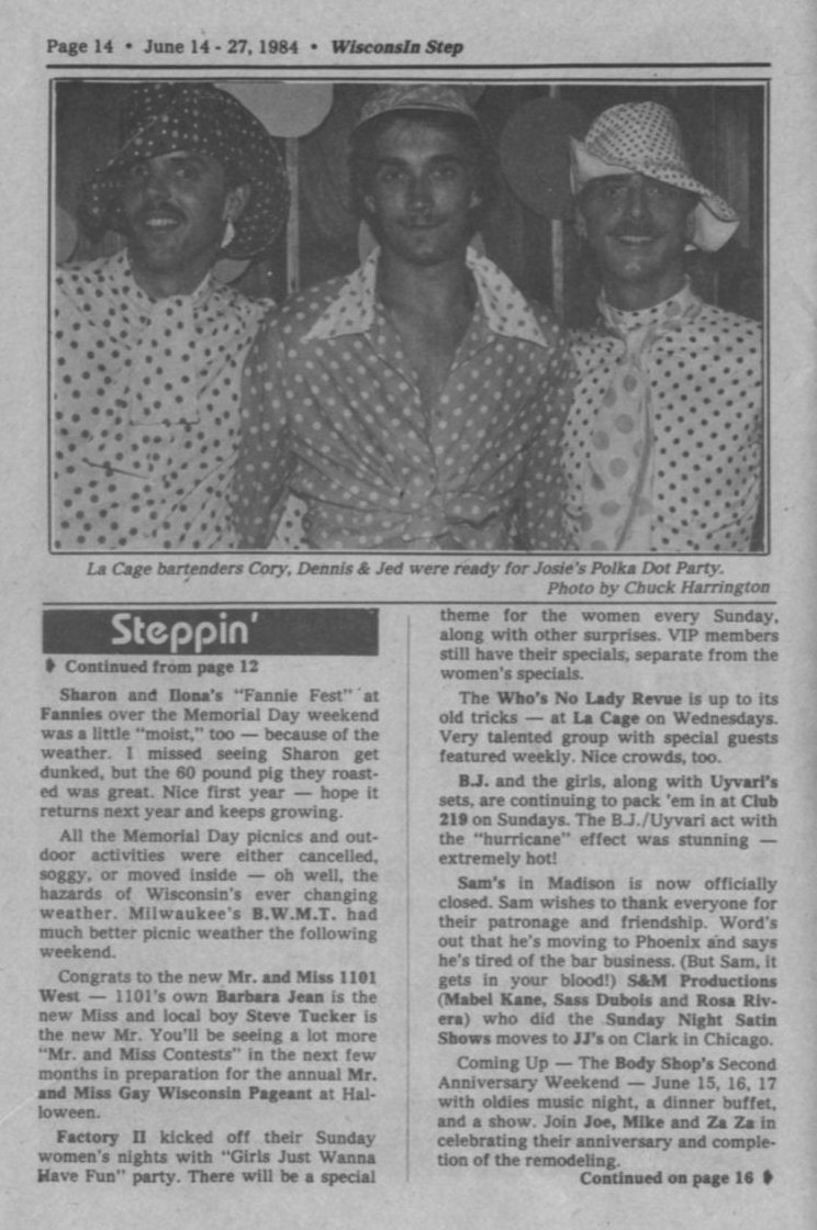 Steppin' Out continued: Fannie Fest, Who's No Lady Revue, Sam's in Madison closed; Body Shop 2nd anniversary weekend