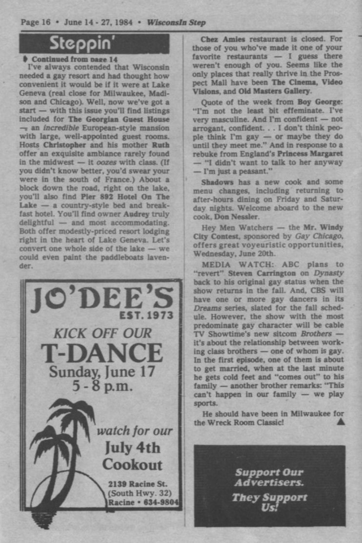 Steppin' Out cont: Georgian Guest House (Lake Geneva), Chez Amies restaurant in Prospect Mall closed; Shadows has a new cook