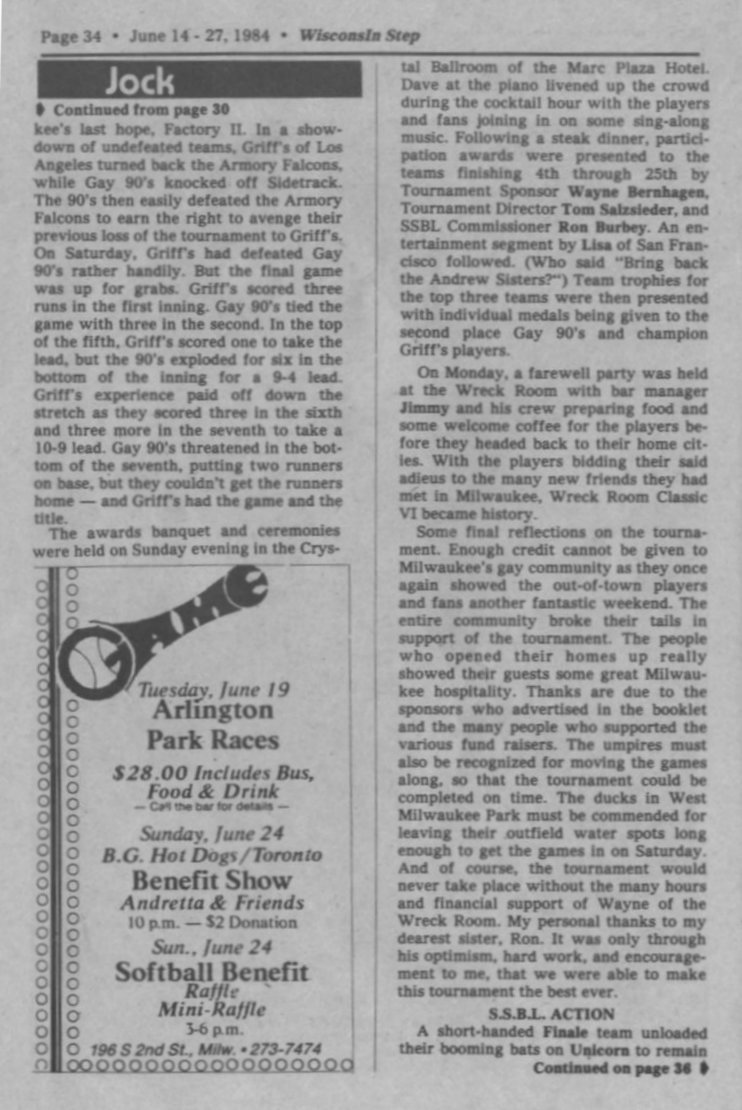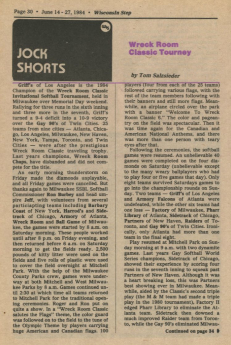 Jock Shorts, cont.: results of 1984 Wreck Room Classic Invitational Softball Tournament + Ad: BallGame