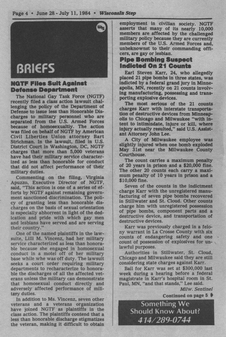 Steppin Out: Summerfest 84 highlights; WLGN (Wisconsin Lesbian/Gay Network) Summer Retreat at The Farm outside Appleton; upcming MAGIC picnic in Madison; upcoming female impersonator (drag) pageants