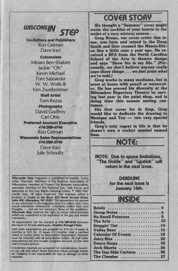 Masthead & Table of Contents; Cover artist: Greg Brown's first cover for In Step