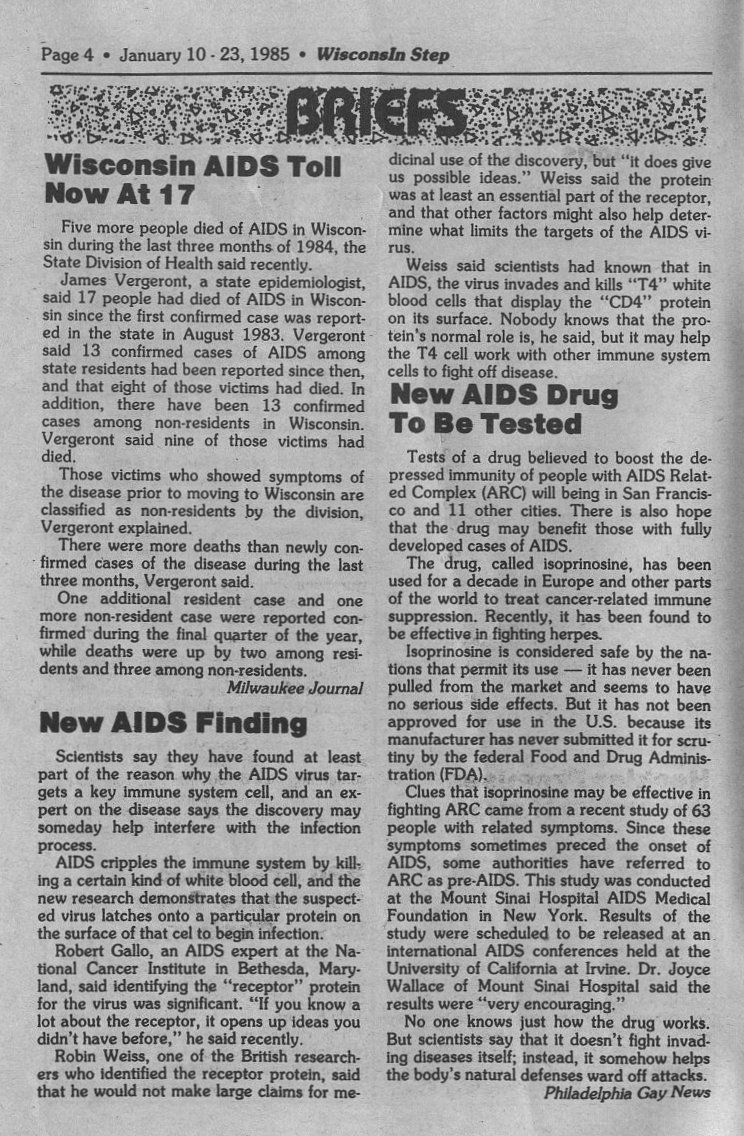 News Briefs: Wisconsin AIDS toll now 17; new AIDS funding; new AIDS drug to be tested (ARC/ AIDS Related Complex)