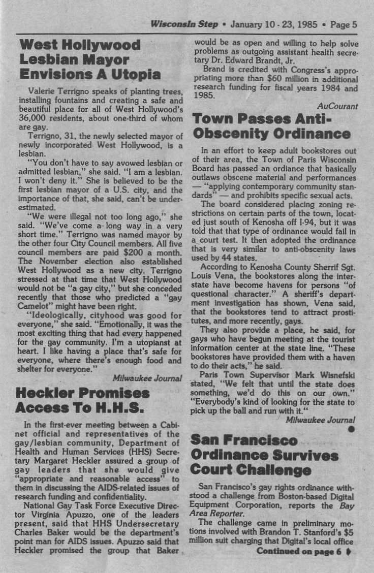 News cont: Town of Paris, Wis. (Kenosha County) passes ordinance outlawing obscene material and certain sexual acts