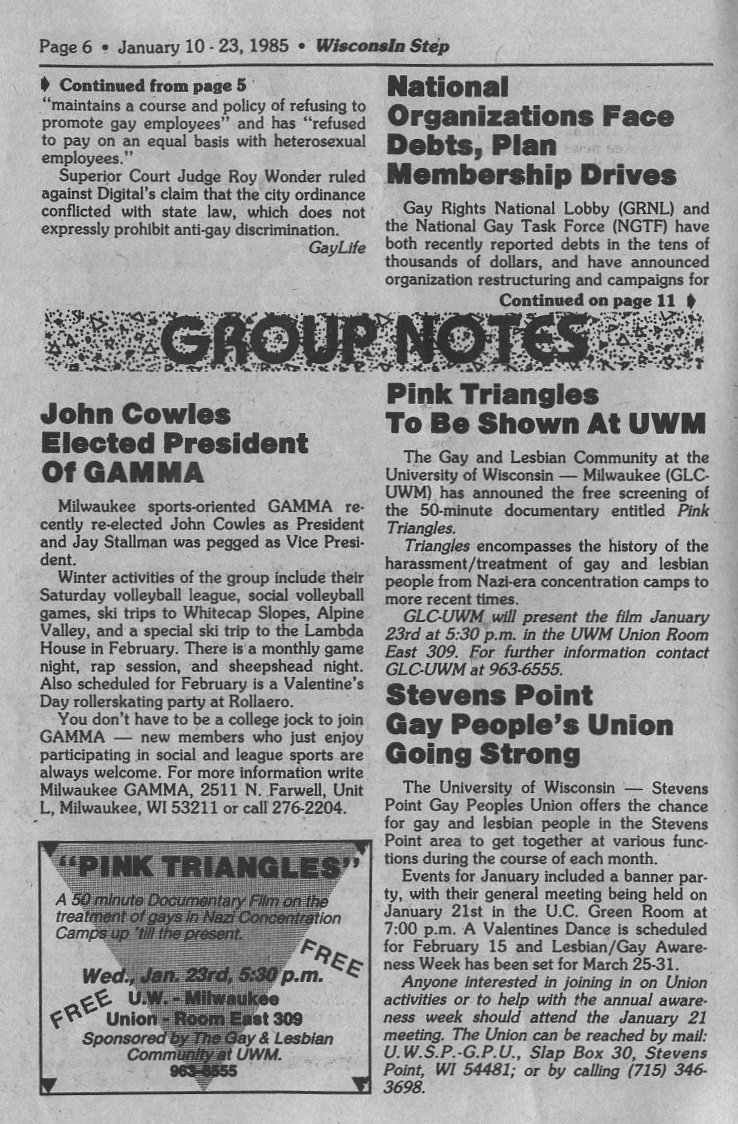 Group Notes: John Cowles re-elected President of GAMMA; documentary "Pink Triangles" to be shown at UWM; UW- Stevens Point Gay Peoples Union going strong