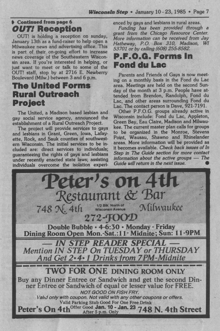 OUT! newspaper reception; The United, Madison, forms Rural Outreach Project; PFOG/ Parents and Friends of Gays forms in Fond du Lac + Ad: Peter's on 4th restaurant