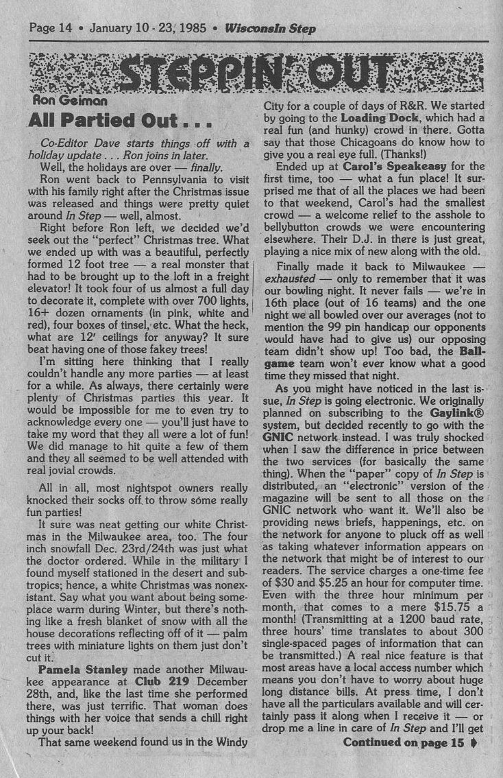 Steppin Out: All Partied Out... Pamela Stanley performs at Club 219; In Step goes electronic, signing up with GNIC network (300 or 1200 baud rate, 103B or 212A protocol modems)