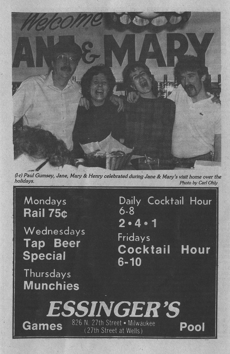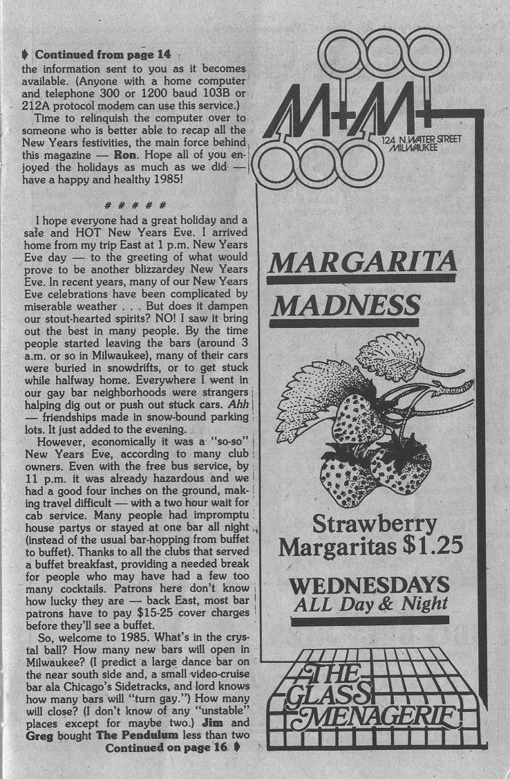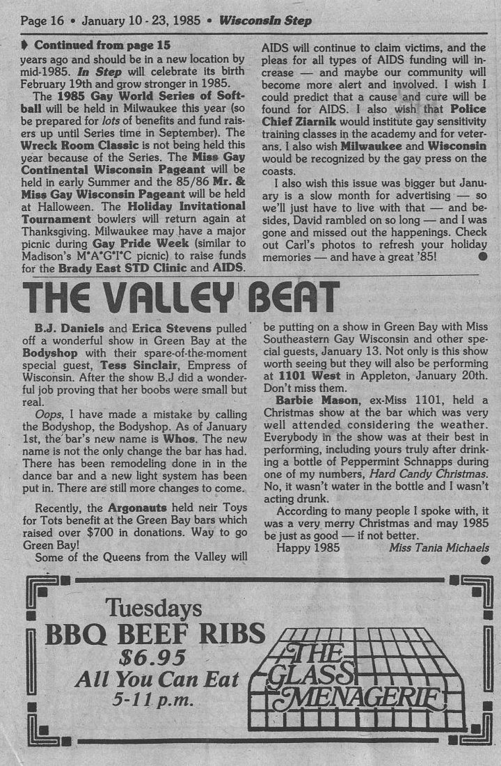 1985 Gay World Series to be held in Milwaukee; The Valley Beat: news from Green Bay and Appleton: Argonauts hold Toys for Tots benefit, Barbie Mason, ex-Miss 1101, holds christmas show at 1101 West, Appleton