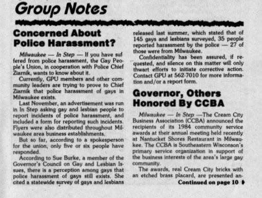 Group Notes: GPU/ Gay Peoples Union gathering information on police harassment; CCBA Annual Dinner (pt. 1)