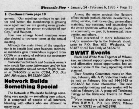 Group Notes, cont: CCBA (pt. 3); The Network in Waukesha; BWMT events