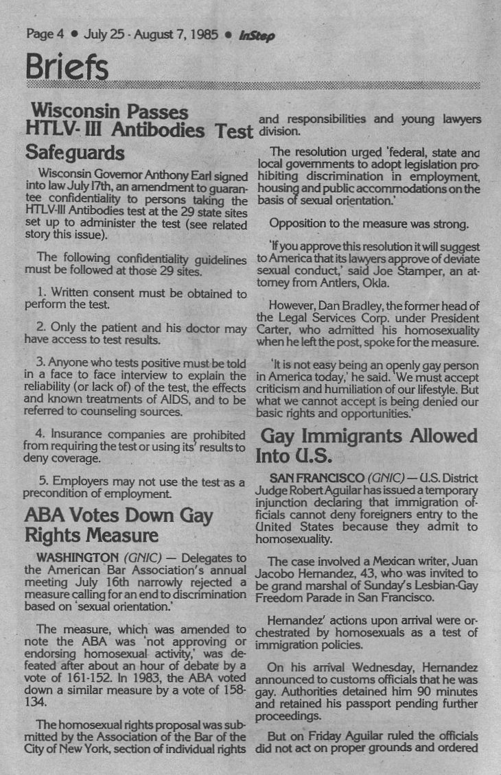 News Briefs: Wis. Governor Tony Earl signs HTLV-III Antibodies safeguards bill