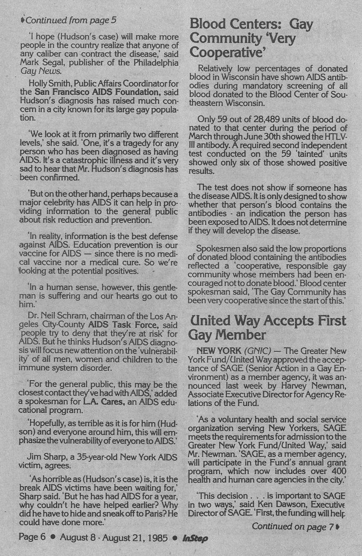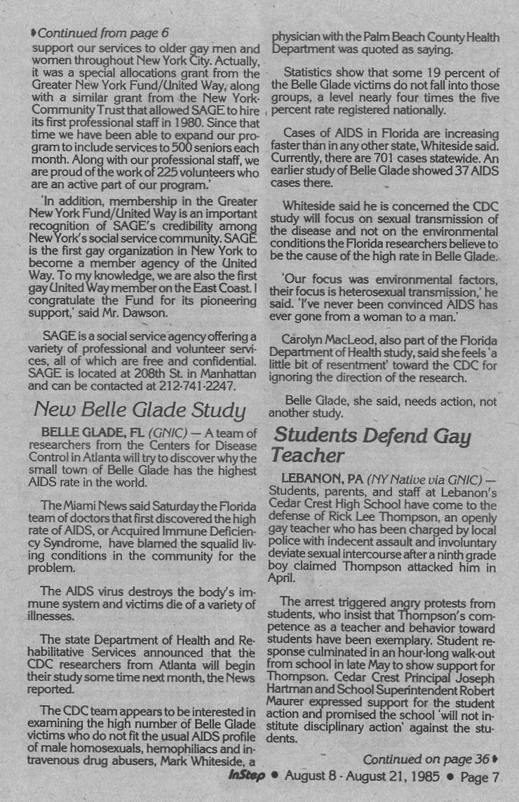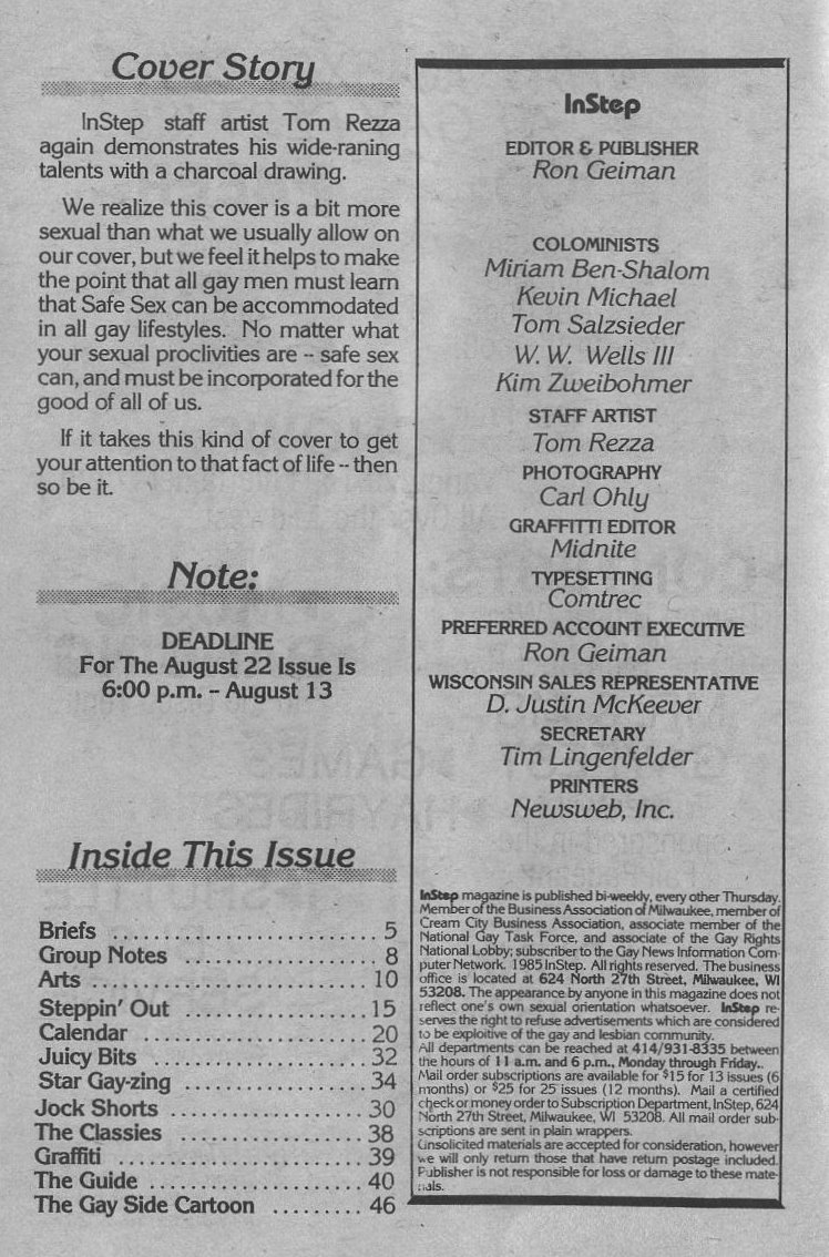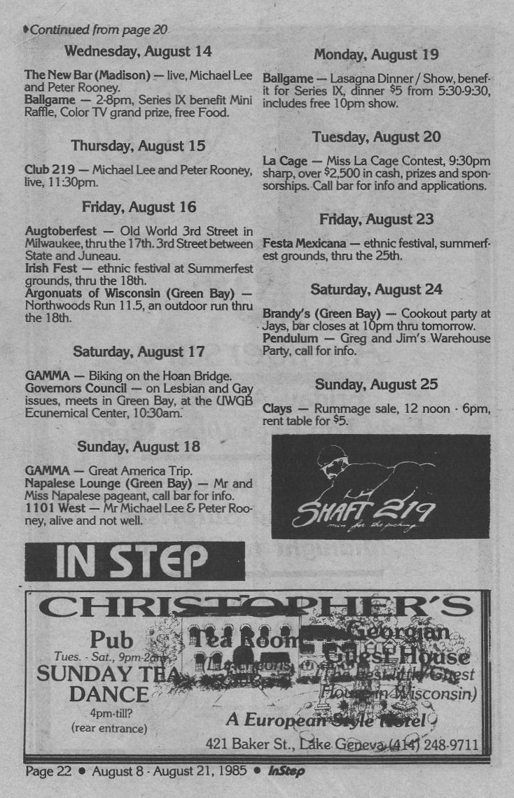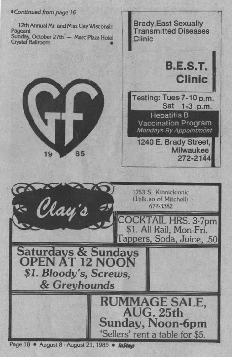 Ads: GayFest 1985 logo; Clay's bar; BESTD Clinic