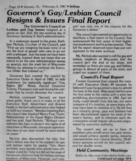 Governor's Council on Gay/Lesbian Issues issues Final Report before resigning on election of incoming Governor Tommy Thompson
