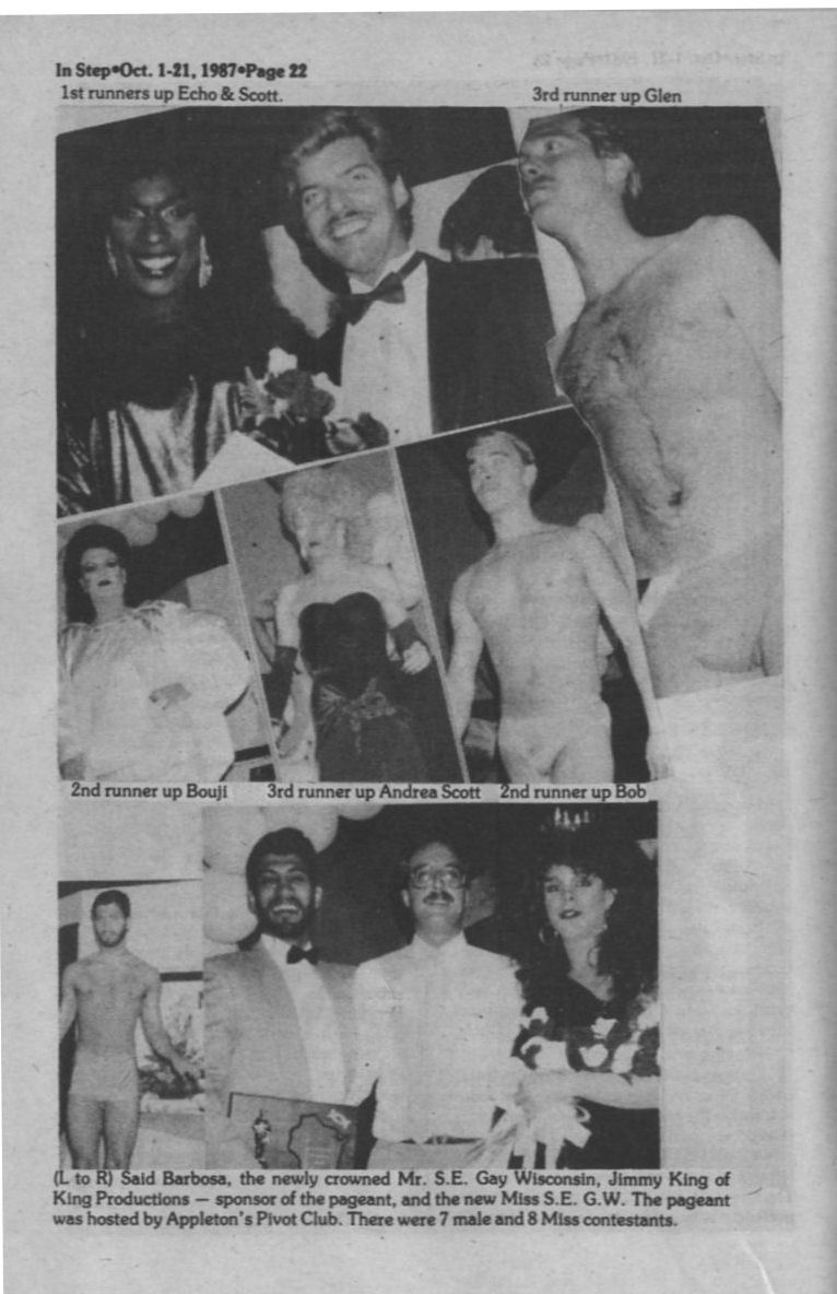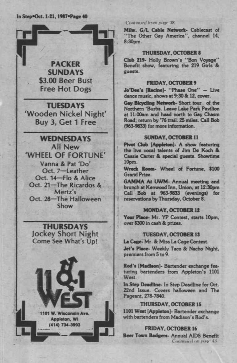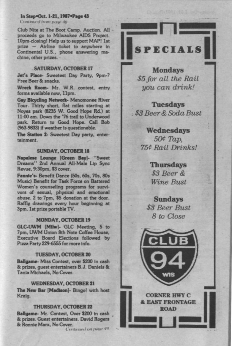 Steppin Out, cont: Pivot Club hosts 5th annual Mr. & Miss South Eastern Gay Wisconsin pageant; Wreck Room MASH party; Your Place 22nd anniversary; La Cage MAP benefit show + Ad: Napalese Lounge