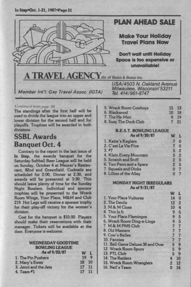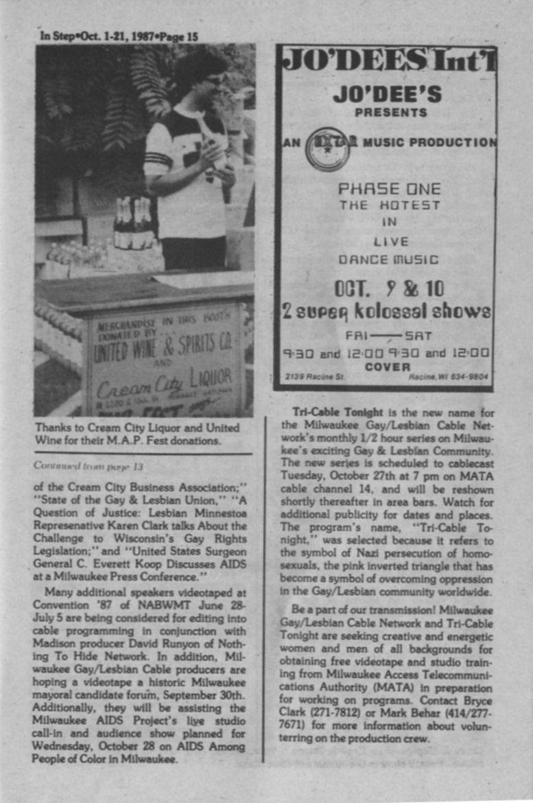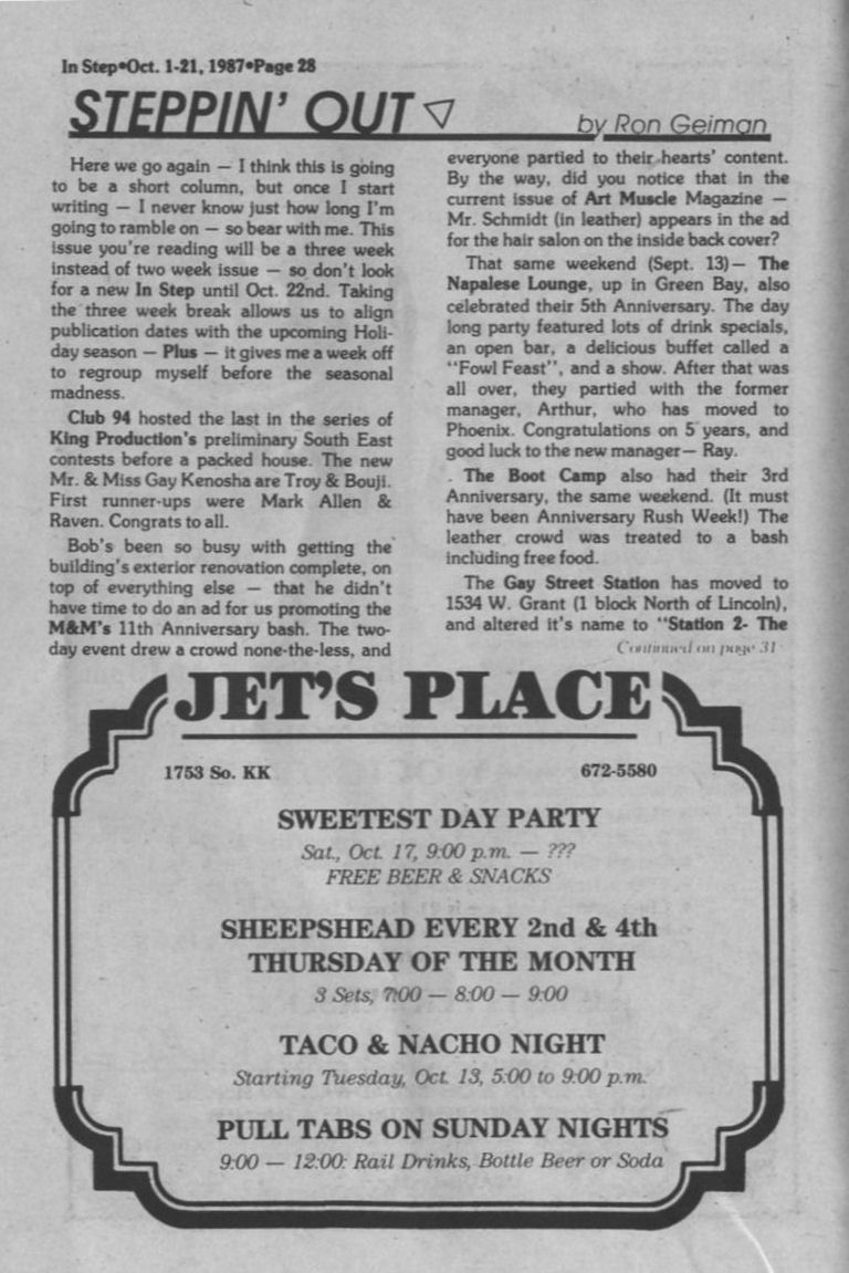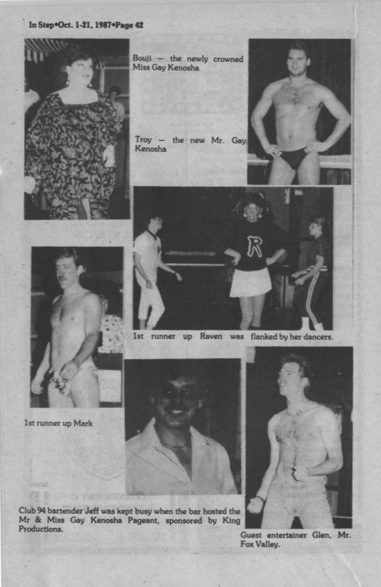 Steppin Out, cont: Pivot Club hosts 5th annual Mr. & Miss South Eastern Gay Wisconsin pageant; Wreck Room MASH party; Your Place 22nd anniversary; La Cage MAP benefit show + Ad: Napalese Lounge