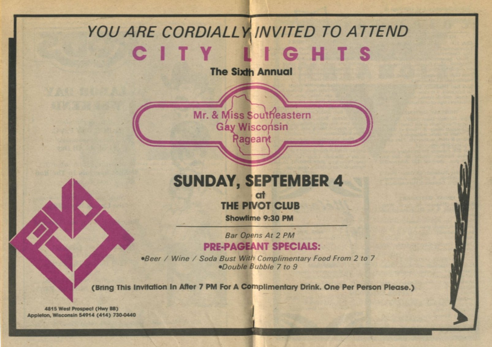 Ad: Pivot Club (Appleton) presents Mr. and Miss Southeastern Gay Wisconsin pageant