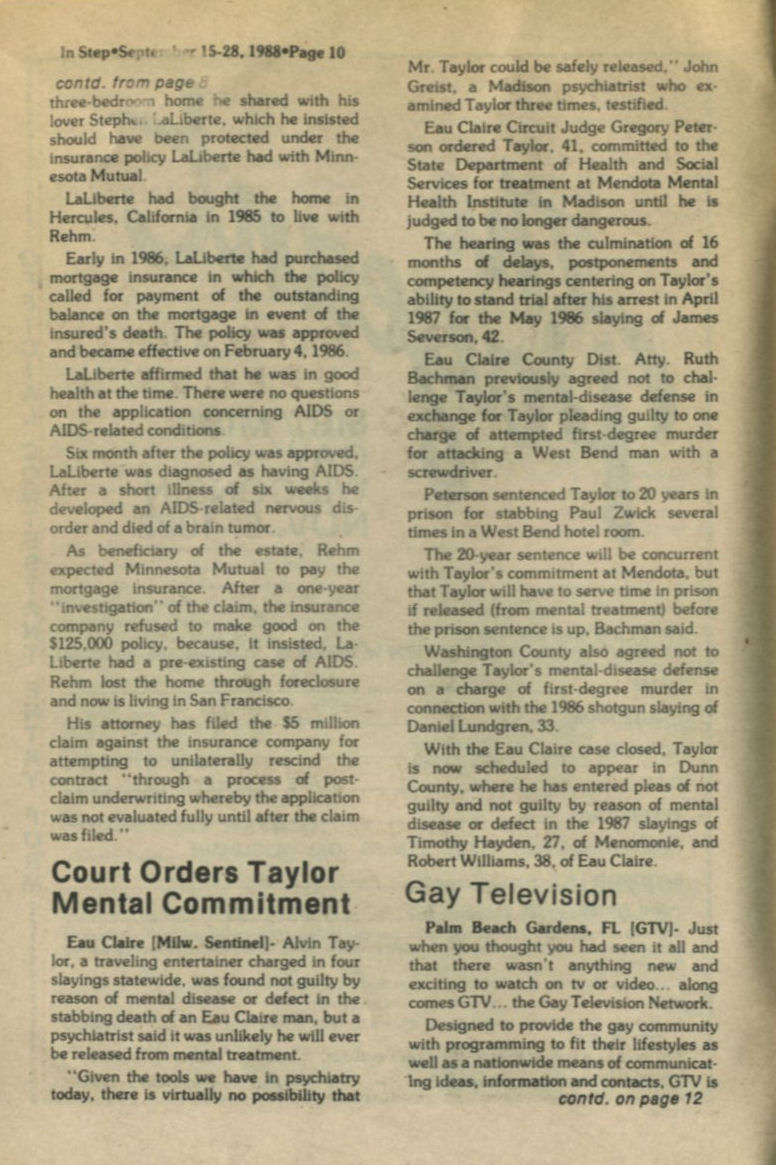 News: Alvin Taylor ordered mentally committed in Eau Claire for slayings; Gay Televison