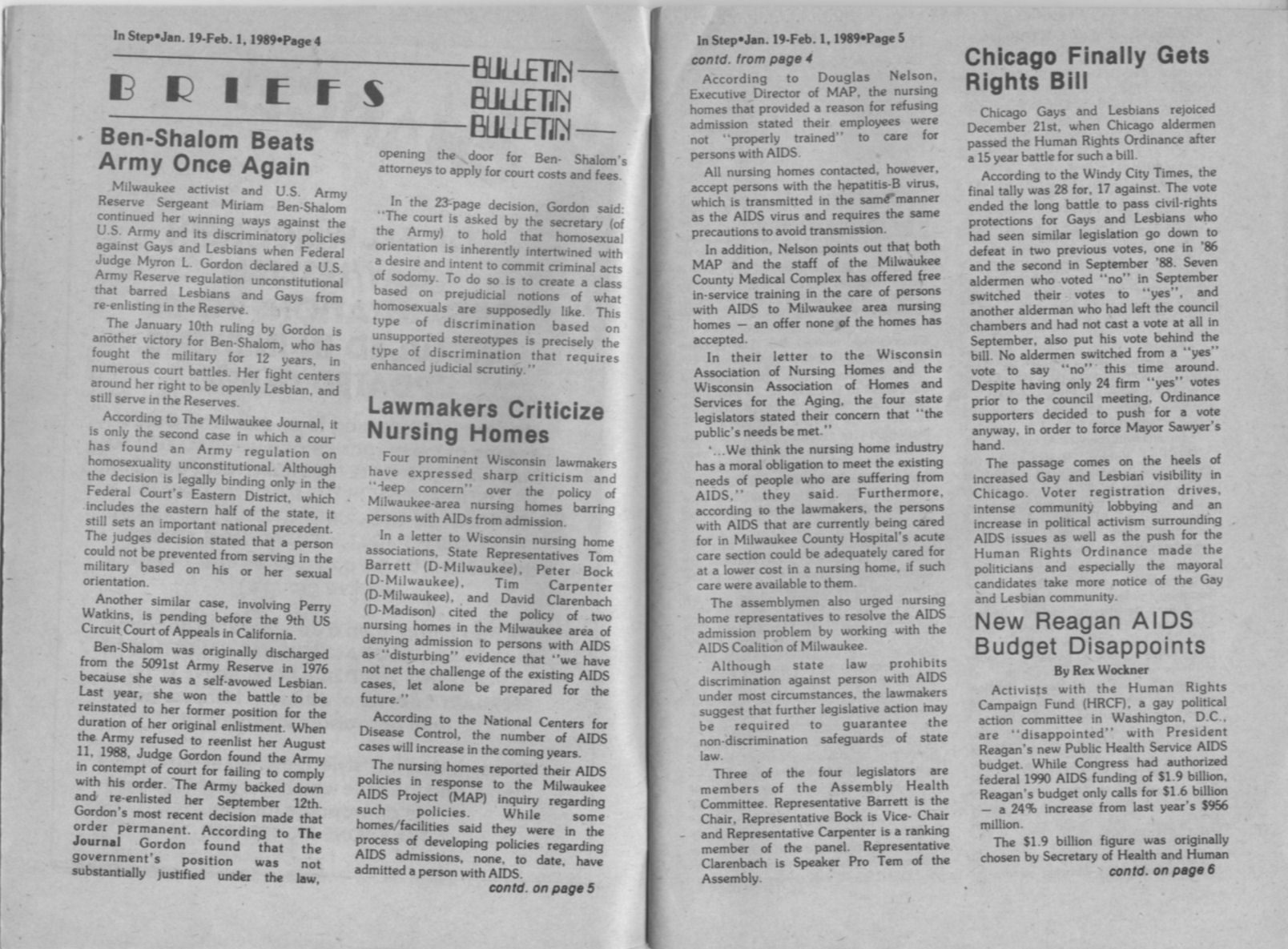 Ben-Shalom news: Federal Judge rules Army Reserve regulation unconstitutional; Lawmakers critizice nursing homes for refusing to accept persons with AIDS for admission.