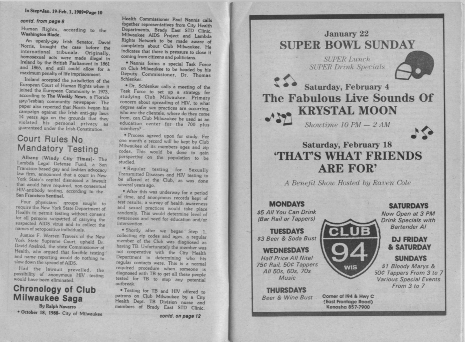 Ad: Club 94 (Kenosha) Super Bowl party