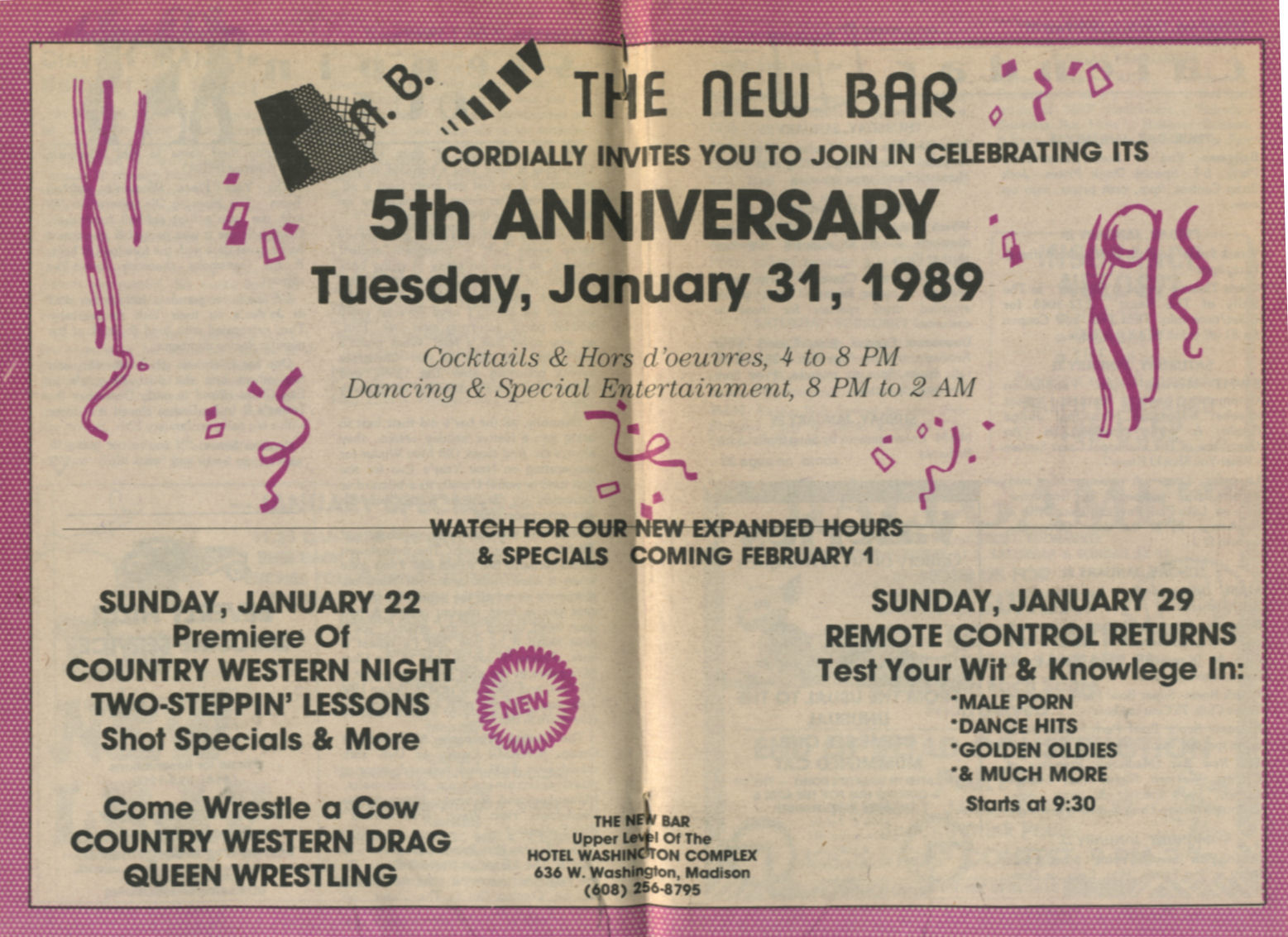 Ad; The New Bar (Madison) 5th Anniversary party