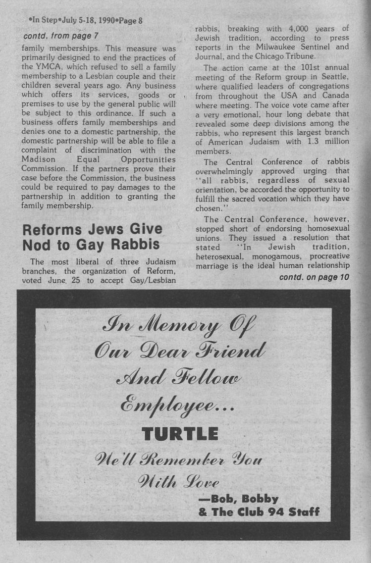 Ad: in memory of fellow employee Turtle, remembered by Bob, Bobby and staff of Club 94;