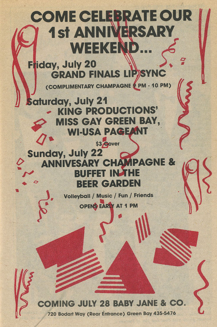 Ad: Za's bar in Green Bay to celebrate 1st anniversary, and Miss Gay Green Bay pageant
