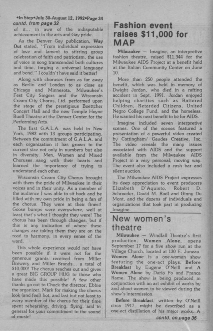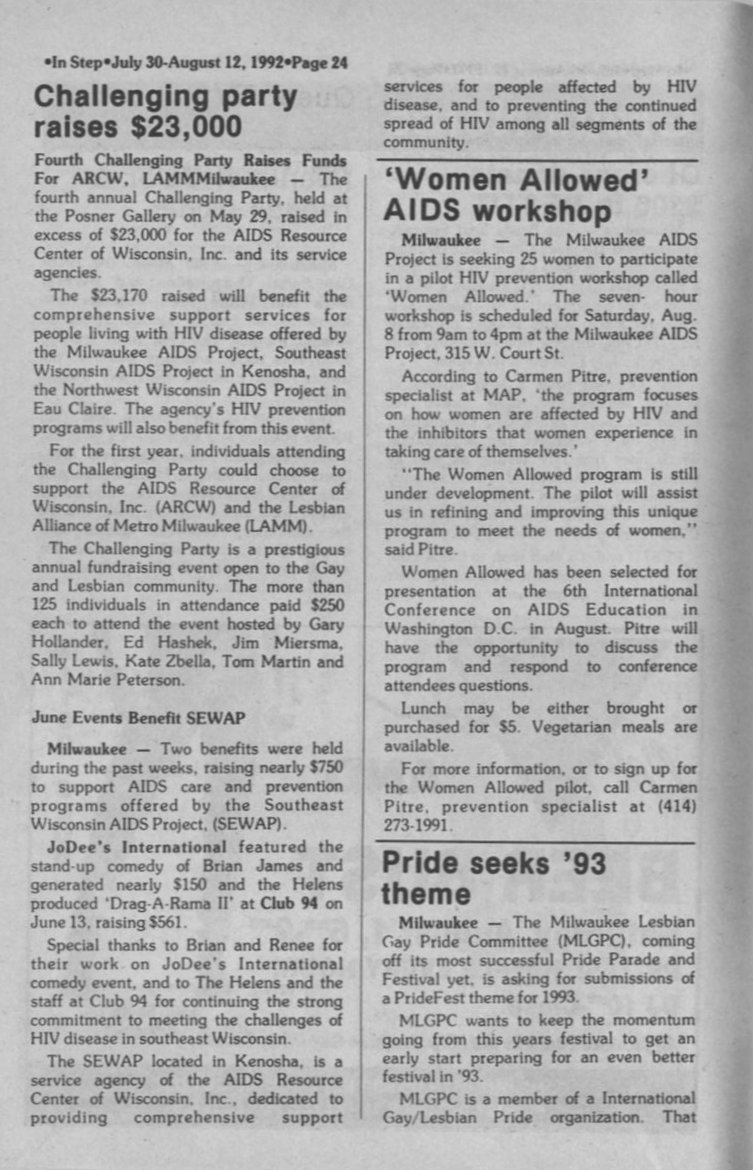 Challenging party raises funds for ARCW and LAMM; "Women Allowed" AIDS workshop held; MLGPC/ Pride group seeks 1993 theme (page 24)