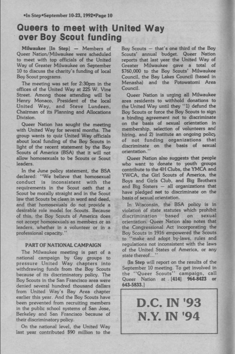 Queers to meet with United Way over Boy Scout funding.