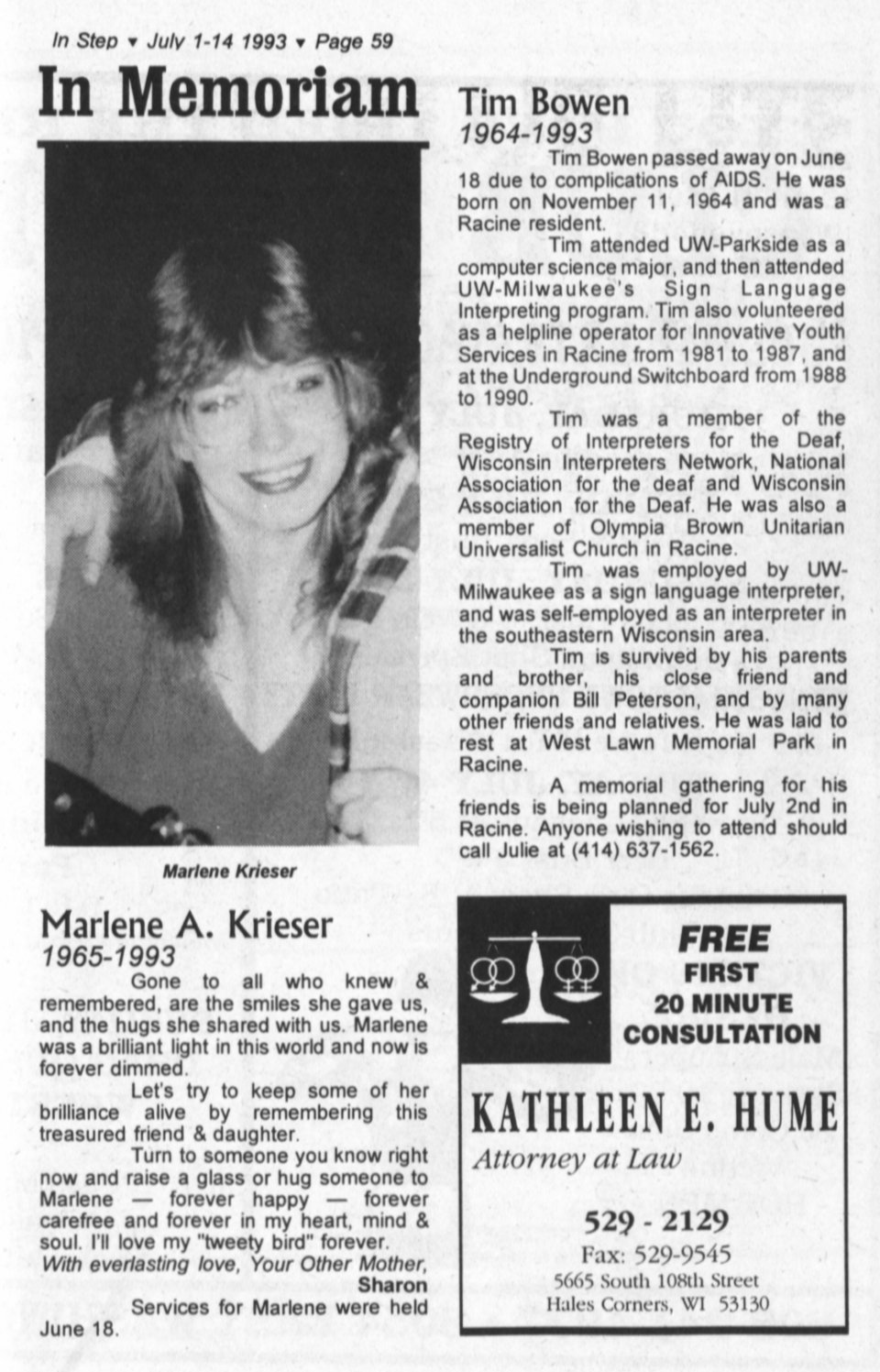 In Memorium: Marlene A. Krieser, Tim Bowen