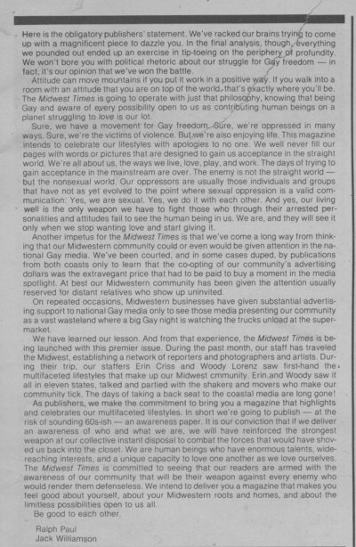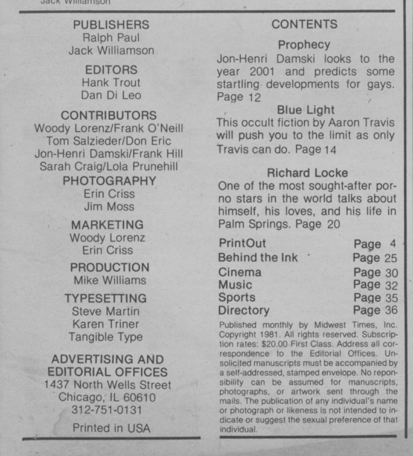 The Midwest Times newspaper was founded by Gay Chicago founder and publisher Ralph-Paul Gernhardt, to fill a need for a regional publication taht would truly represent the interests and activities of the gay community in the midwest. Gay Chicago had begun publishing in about 1976, and by the end of the 1970s his company, Ultra Ink Inc., had made attempts to establish several other local publications aside from Gay Chicago, including Gay Detroit, Gay Milwaukee, and Gay Ohio. The demands of several publications attempting to cover activities so geographically disbursed made those efforts difficult to maintain however, so all eventually were merged into a more regional representation of Gay Chicago covering all of the Midwest, as well as a brief foray into this newspaper format, the Midwest Times, beginning in January 1981. Disclaimer-- Any publications reproduced here are shown without release because we have been unable to locate the copyright holder. Their reproduction is intended to document and honor those who made such early contributions to the community and with full desire to include proper credit, if known. We will remove any reproduction immediately upon request of the valid copyright holder. |