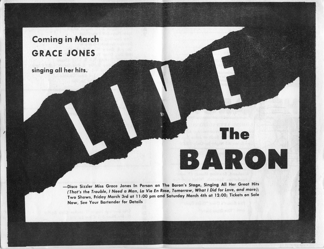 Advertisement: Grace Jones to perform at The Baron disco