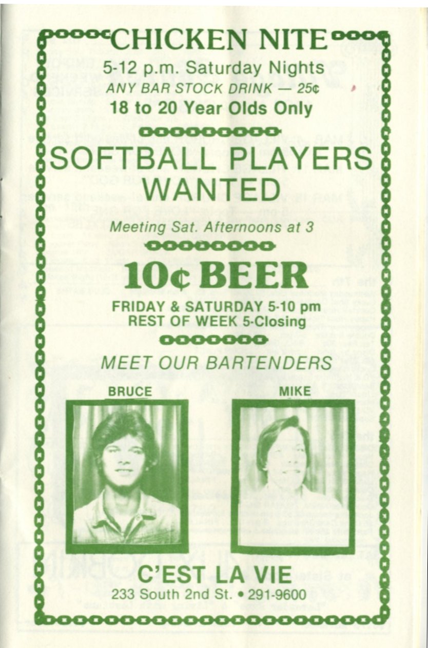 Ad: Cest La Vie: Chicken Night, and bartenders Bruce and Mike