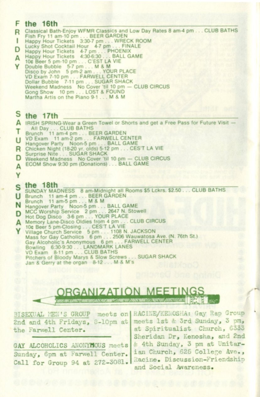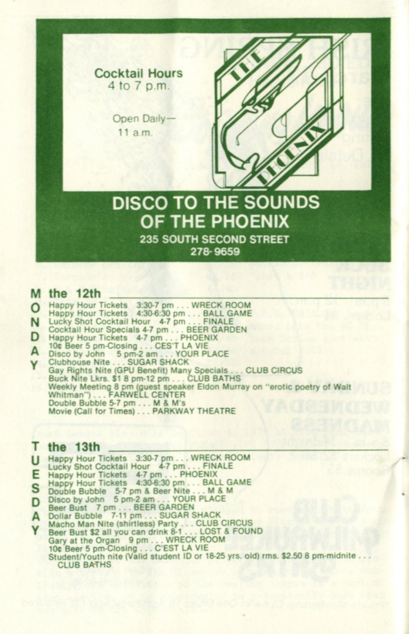 What's Happening, cont: Gay Peoples Union report: President Miki Doxtater and vice president Scott Gatewood are making the Farewell Center more dynamic, with rejuventaed Monday night meetings and reinstated hotline + Daily events