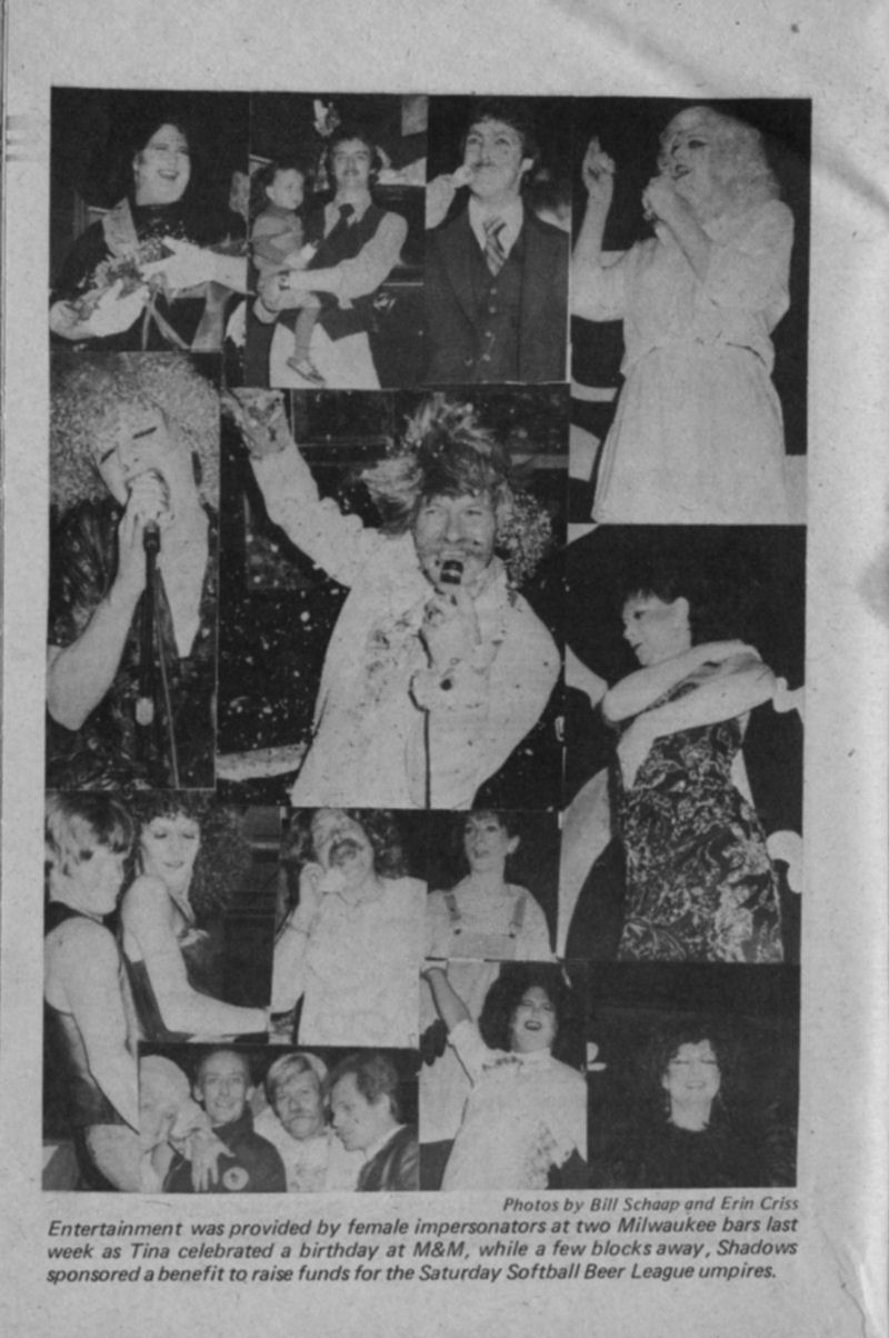 Photos of female impersonators at two events: Party at M&M for Tina's birthday, and benefit at Shadows for SSBL team umpires (click here to view detailed photos)
