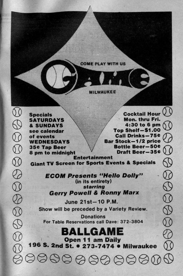 Advertisement for Ball Game bar