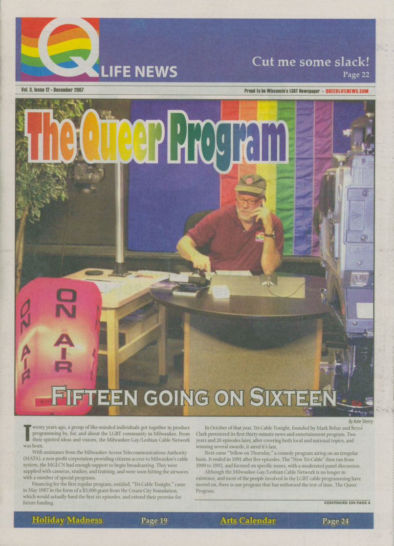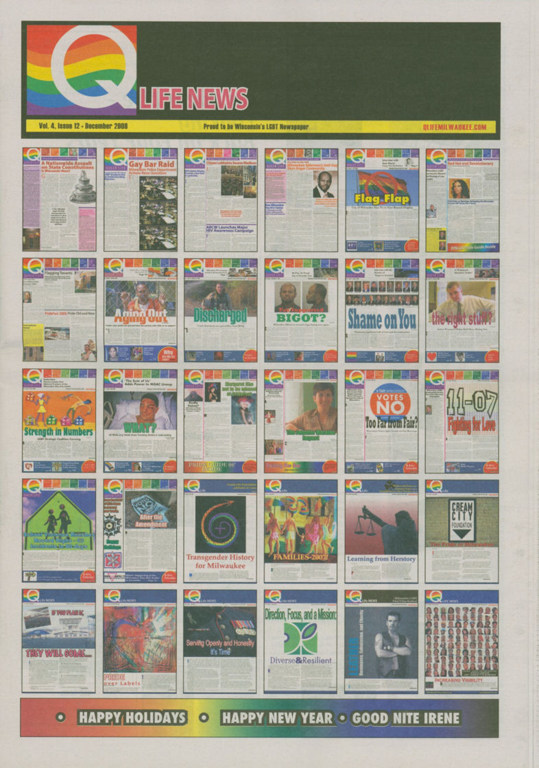 Cover Gallery: The first issue of Queer Life (also known as Q-Life) appeared on Dec. 15, 2004. Queer Life was founded to give Milwaukee and Wisconsin a true newspaper for the first time in several years, since the demise of both In Step and Wisconsin Light. Coincidentally, it was started up in the same month that another Milwaukee-based newspaper, Outbound News, also began publishing. While Outbound News ceased publishing after just a year, Queer Life (now commonly referred to as Q-Life) continued to go strong; by its first anniversary, it was being well received by the community and served an important niche. As with most magazines and newspapers, this paper also struggled to survive. Its first major crisis was in August 2006, when Don Hoffman, the Editor and one of the owners of the paper, abruptly resigned. Co-owners Nancy Meeks and Carole Wehner were left with a paper without direction and in serious financial shape. The community rallied however, and although no September issue was printed, within a few weeks the paper had been transferred to new owners, and Kate Sherry took over as Managing Editor. The paper had a very positive impact on the community. As well as being widely available in LGBT bars and businesses in SE Wisconsin, it was widely available to the entire community as a free pick-up paper at retail stores (such as pharmacies and grocery stores, like Pick 'n Save). Its first page frequently featured a local organization or business that was observing an anniversary or making a major community impact. These included the Queer Program, Cream City Foundation, Diverse & Resilient, the Milwaukee Gay Arts Center,and This Is It bar. Meanwhile, the paper struggled to stay on its feet. The number of pages in each monthly issue was as many as 60 or 56 pages in volume 1, then settled at around 48 to 40 pages per issue for volume 2; that was then reduced to an average of around 28 pages per issue in volume 3. Most issues in volume 4 came in at just 24 pages per issue to try to keep its costs better aligned with revenues. Unfortunately, it couldn't last. Printing costs, and lack of payments coming in from advertisers (not to mention the difficulty of getting the ad in the first place) had taken their toll. Like most LGBT publications in Wisconsin, they were working on a shoestring budget - going without - working around - and recruiting friends to help out. After sacrificed paychecks, and long hours, the staff were running out of steam, and despite last-ditch efforts to reduce costs by changing printers, the owners of Q-Life decided to stop publishing with the December, 2008 issue. |
