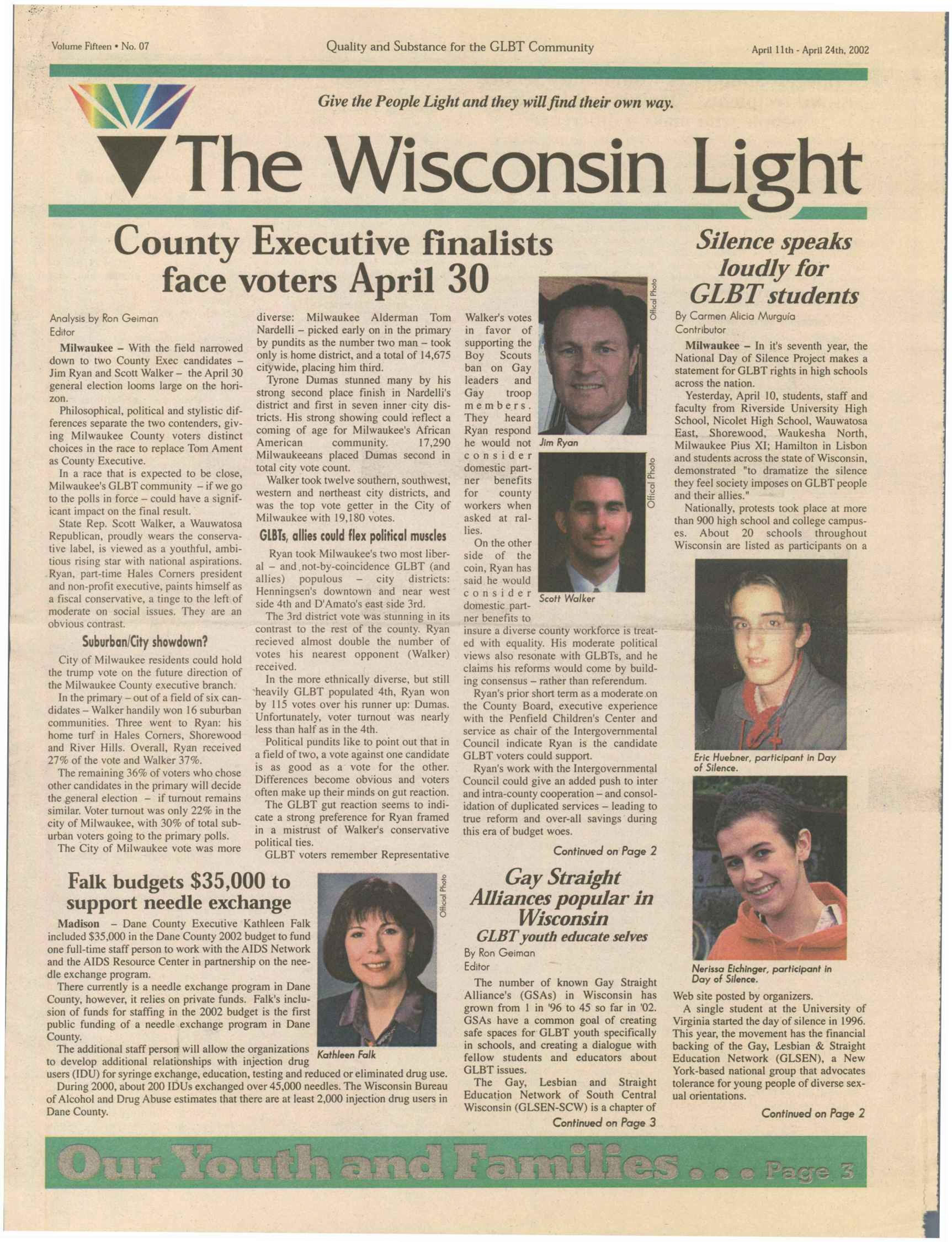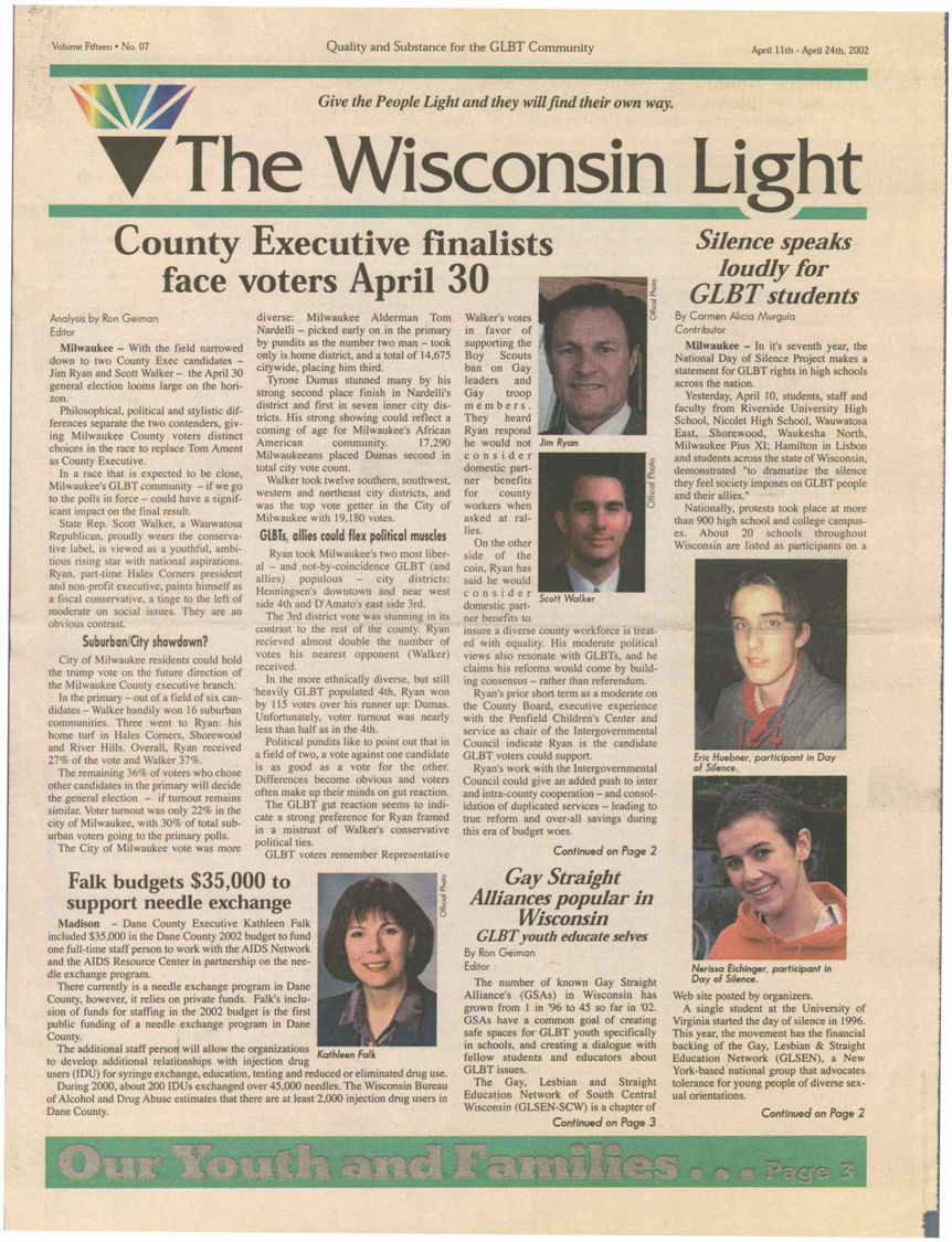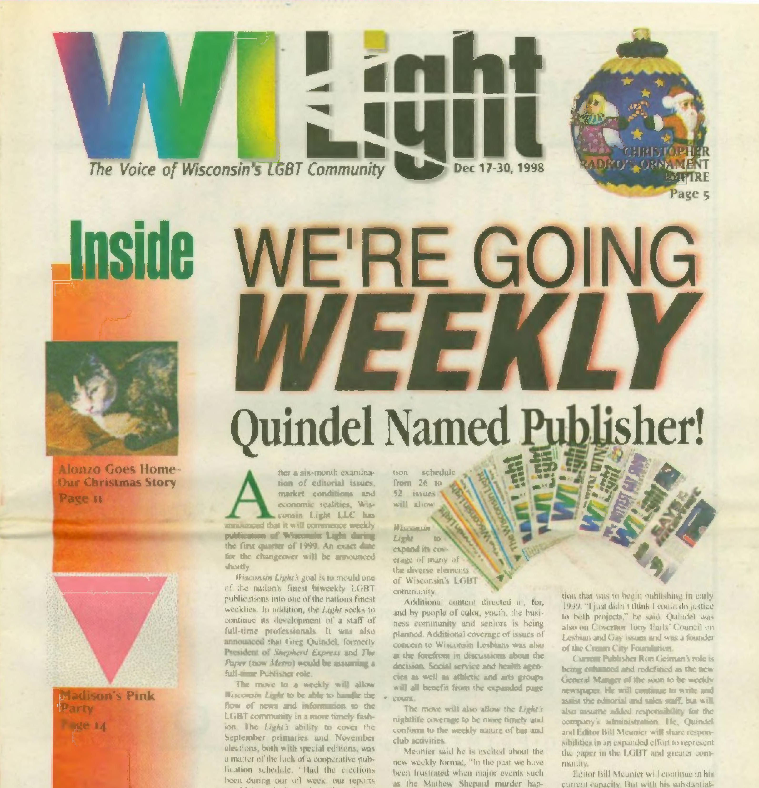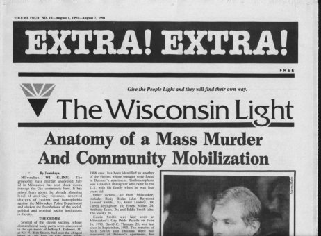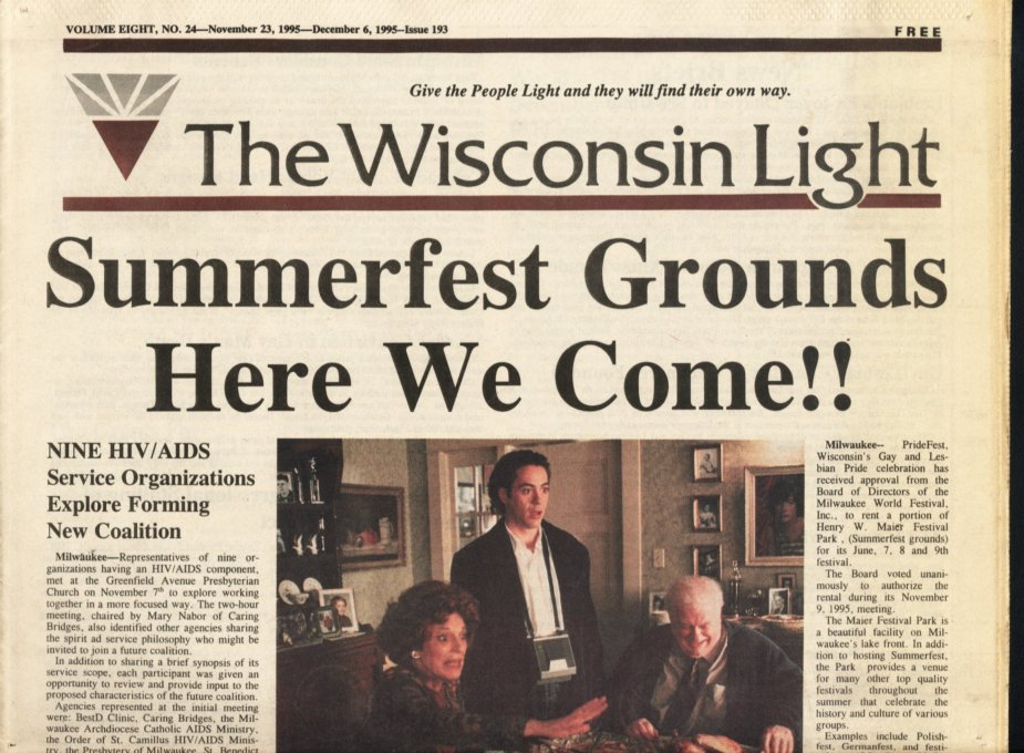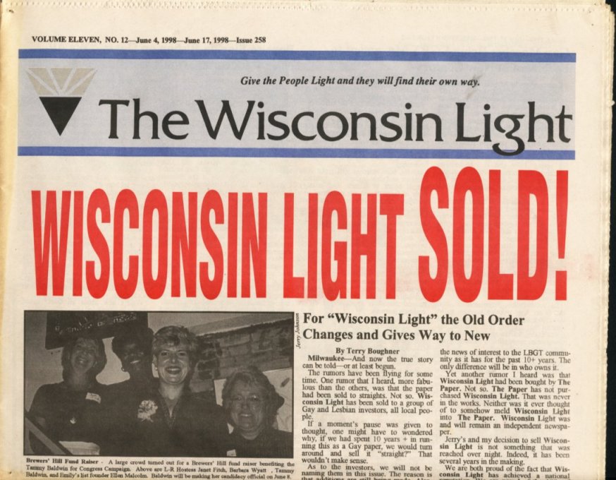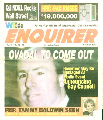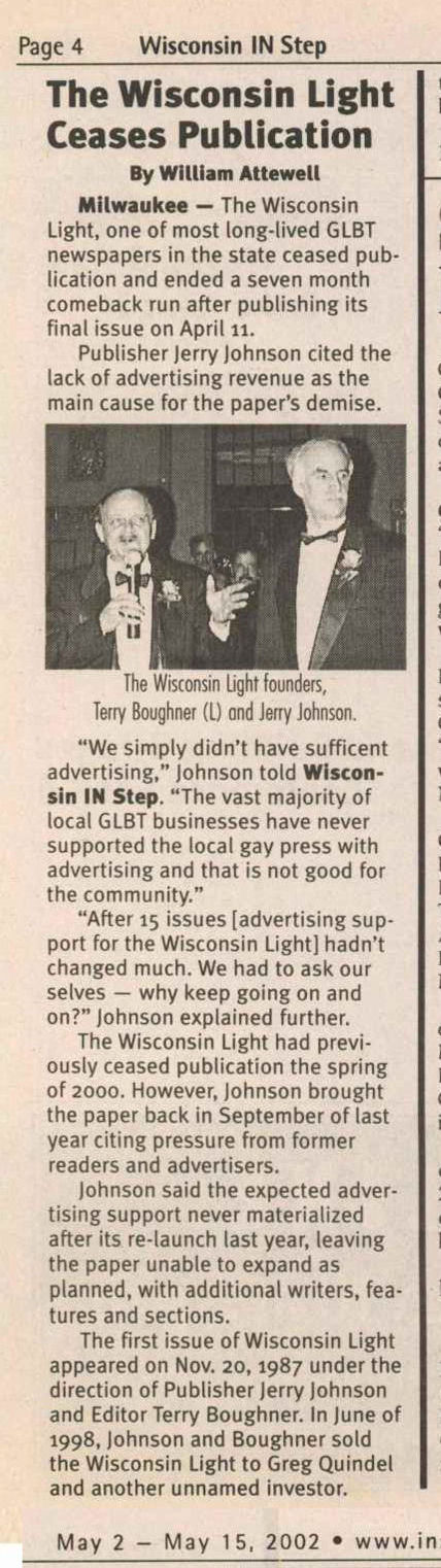 Cover Galleries: History of Wisconsin Light newspaper, written by Jamakaya and reproduced here courtesy of In Step: The first issue of Wisconsin Light appeared on Nov. 20, 1987 under the direction of Publisher Jerry Johnson and Editor Terry Boughner. The front page banner included the motto: “Give the People Light and they will find their own way.” The premiere issue indicates that Wisconsin Light was initiated as a direct successor to OUT, a small monthly newspaper based in Madison which had ceased publication that summer. IN Step, in a 5-1/2” by 8-1/2” magazine format at that time, was primarily covering the bar scene, and many activists felt a need to launch a new publication that would include a fuller array of news and commentary. Ron Geiman, publisher of IN Step, supported the effort. The first issues of Wisconsin Light came out monthly, but by the spring of 1988, in hopes of raising more advertising revenue and accommodating the increasing volume of news copy by and about gays, a decision was made to publish bi-weekly. This the Light did consistently until March of 1999, when it went weekly. High water marks for Wisconsin Light during its 12-1/2 year history include its extensive coverage of the Jeffrey Dahmer case in 1991-92. The Light published an “Extra” edition on Aug. 1, 1991 to provide timely information on many aspects of the mass murder, which had a dramatic impact on the city’s gay and lesbian community. The Light scooped the mainstream media with information on some of Dahmer’s victims and past evidence of Milwaukee police officers’ harassment and insensitivity to gays. The Light’s coverage of the Dahmer case won awards from the National Gay and Lesbian Press Association. On Nov. 6, 1997, Wisconsin Light published a 120-page anniversary issue called “A Decade of Light.” It included a massive timeline of all major LGBT events -- local, statewide and national -- that had been reported in the Light since its founding, along with hundreds of photos of those events, most taken by Jerry Johnson. It stands as the most thorough history ever compiled of that 10-year period of LGBT life in Wisconsin. That same issue included an article by the publisher that follows the challenges, struggles, and successes of the newspaper, such as how they first began to computerize operations. It is thus also a story of the evolution of a periodical in times of changing technology. On the debit side, the Light was often marred by typographical errors which rendered words or headlines incomprehensible. Sometimes it caused inadvertent humor, like the time Light reported that a gay editor had been “fried” (rather than “fired”) for outing someone. The final issue was true to form with the following tribute: “Congratulations to Hilary Swank for his Best Actress Oscar...” In June of 1998, Johnson and Boughner sold the Wisconsin Light to Greg Quindel and another unnamed investor. “Jerry and I spent ten years plus and we did the best we possibly could,” former editor Terry Boughner told IN Step. “We’re very proud of the national reputation we built for the Light. But it was time to hand it off to others. ‘Hail and farewell!’ was our attitude. There comes a point you just have to let go. I don’t regret it. Now Jerry and I have a life again.” Bill Meunier, a longtime political columnist for Wisconsin Light, was named editor and Ron Geiman, who had sold IN Step to Bill Attewell and Jorge Cabal in 1996, was named publisher. At the end of 1998, Light announced that Greg Quindel would take over as publisher and the newspaper would begin publishing weekly. Its first weekly issue debuted in March, 1999. Exactly one year later, the Light published its final issue. As the paper grew in size in 1998 and into 1999 (and as it approached going weekly), it lost much of its local content. For example, the "Spotlight' page, which had previously typically highlighted a Wisconsin bar or organization, was more likely to showcase a recent movie or national celebrity. Coverage of national movies and celebrities was a common theme, crowding out more local articles that might have put the spotlight on newer Wisconsin-based organizations or LGBT businesses. As such, later volumes of the paper are less useful to Wisconsin LGBT historians. As with many other LGBT papers and magazines at the time nationally, the paper was bombarded with large paid advertisements for national internet and 800 call-in sex lines. The paper tried to segregate those ads in a new 'Section X' (and later as 'Purely Personal'), which they ran as the middle four pages of the paper (with separate page numbering), allowing it to be easily pulled out and discarded if so desired. At first it was even printed upside down to better differentiate the contents. There were some struggles to maintain the paper in 1999. As early as September 1999, with volume 12 issue 34, there were obvious signs of stress. In addition to the decision to go weekly the prior year (in hopes of better ad revenue), editor Bill Meunier was appointed to become Director of Internet Development in hopes of leveraging internet content as another revenue stream, and a new editor (Nadine A. Walther) was selected after a three-month search, starting with the January, 2000 issue (vol 13-no. 5). The end was not a surprise either. Just a few issues prior, the Publisher, Greg Quindel, had printed a "Letter from the Publisher" describing the challenges faced in publishing a weekly newspaper, and in which he described his efforts to reach out to the other two Wisconsin LGBT publications (IN Step and Quest) about cooperative efforts. Several issues then came out with layout problems, using only about 85% of the available space on each page. Despite all their attempts to save it, the paper would shut down within six months. An article in 'IN Step' outlined more details of the paper's history and demise. Highlights from that article: (or view the full In 