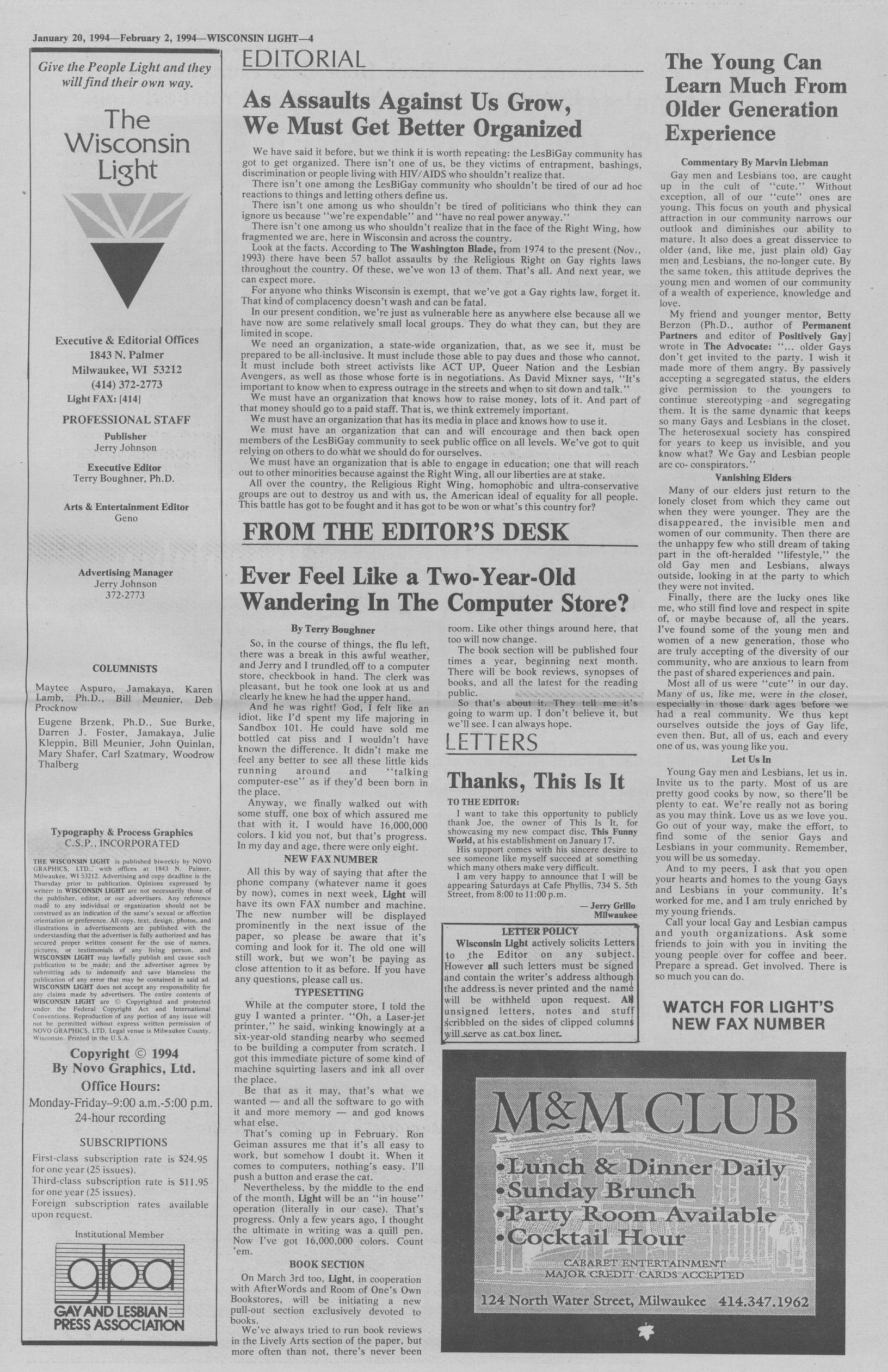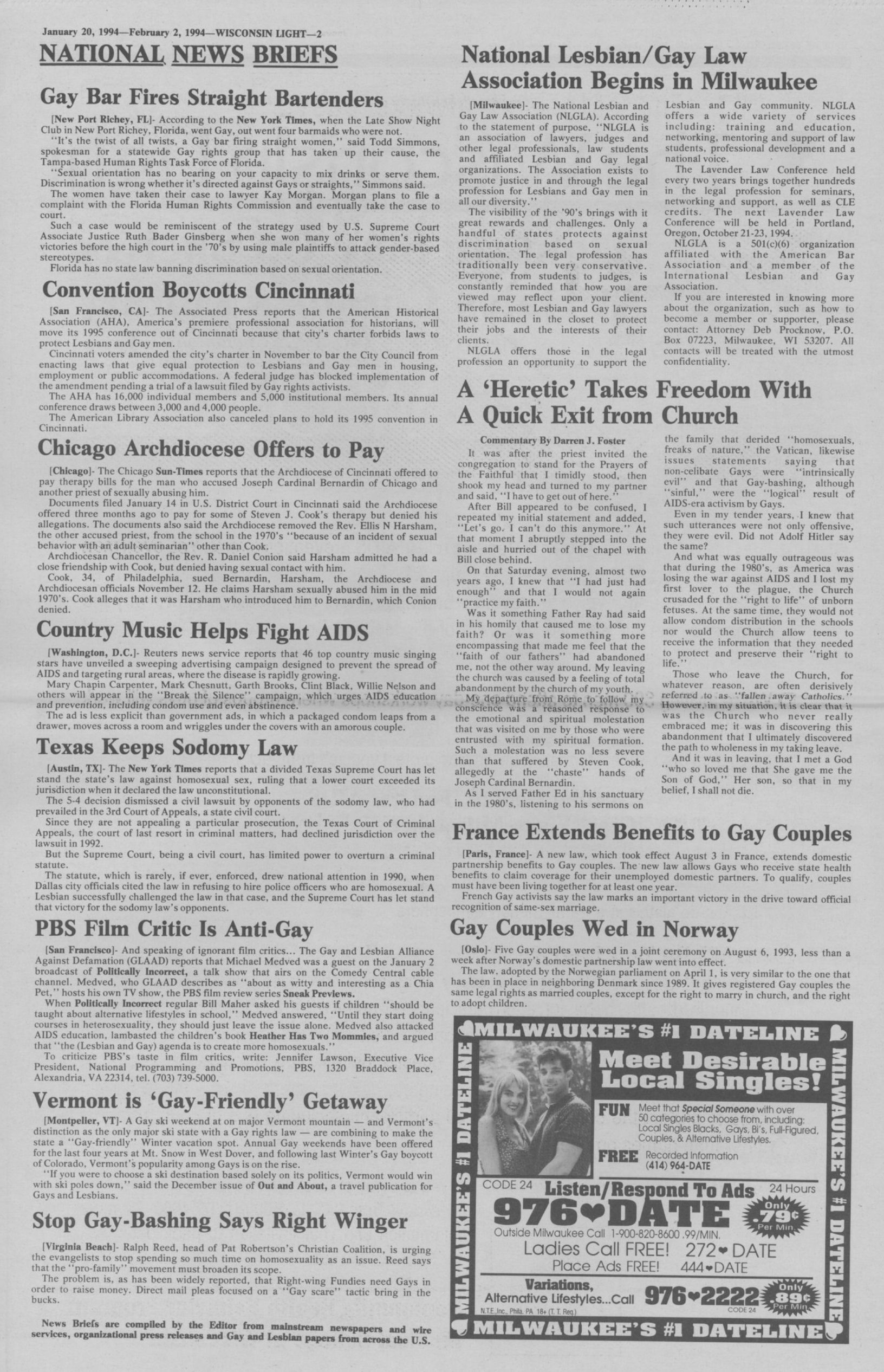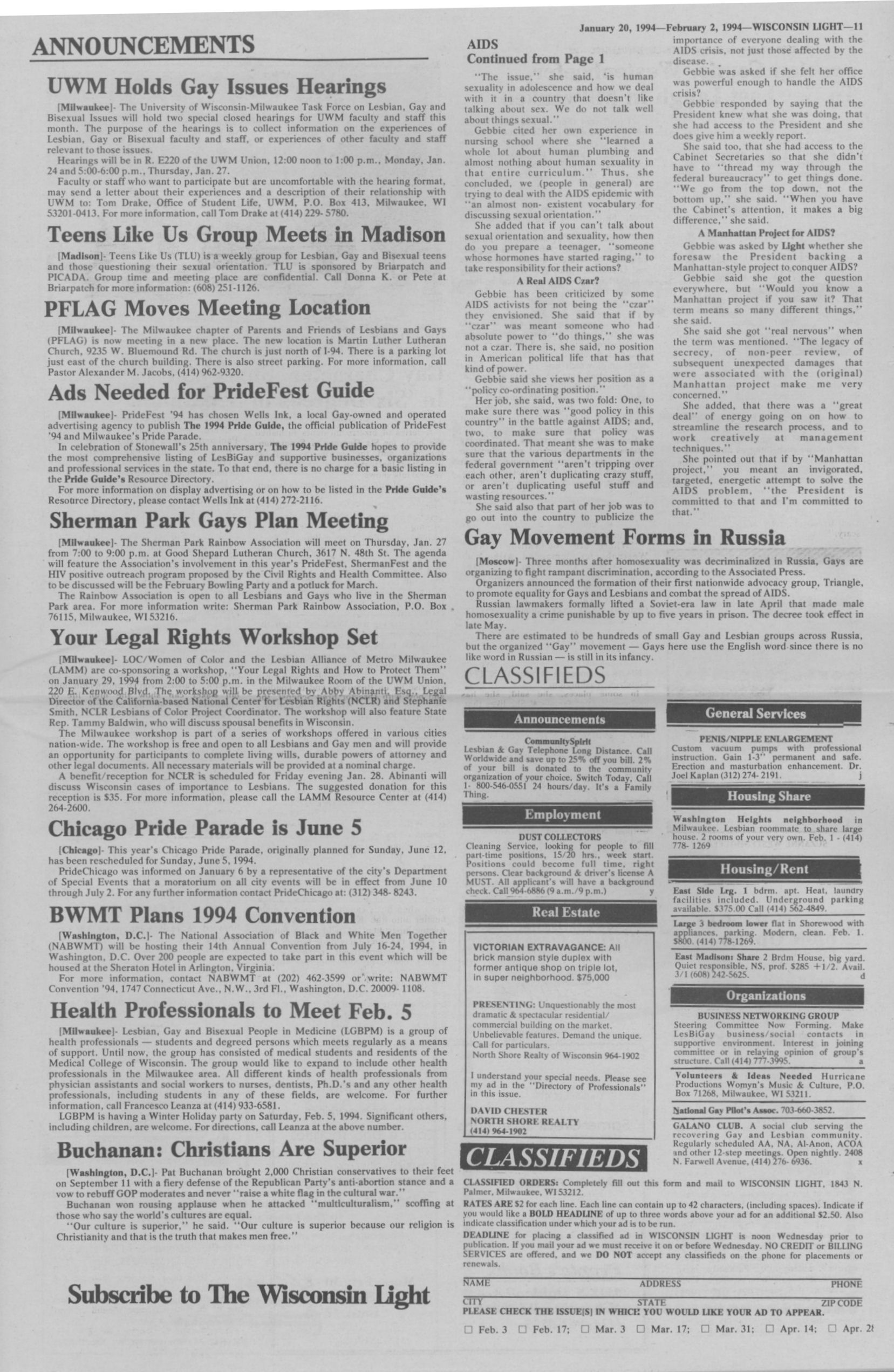 PrideFest plans for 1994: theme "Stonewall 25 Our Time to Shine", relocates to Veterans Park, extended hours to two full days, new additions are first ever dance tent and history display; Back Door BBS service provides access to PrideFest information via modem! Lawrence University (Appleton) to host "Sexuality in the Acedemay: A Conference on Gay and Lesbian Studies": 3rd annual B-GLAD (Bisexual Gay and lesbian Awareness Day) conference hosted by Lawrence University's Bisexual, Gay and Lesbian Awareness organization. Christopher Lane of UWM will be one of the speakers.