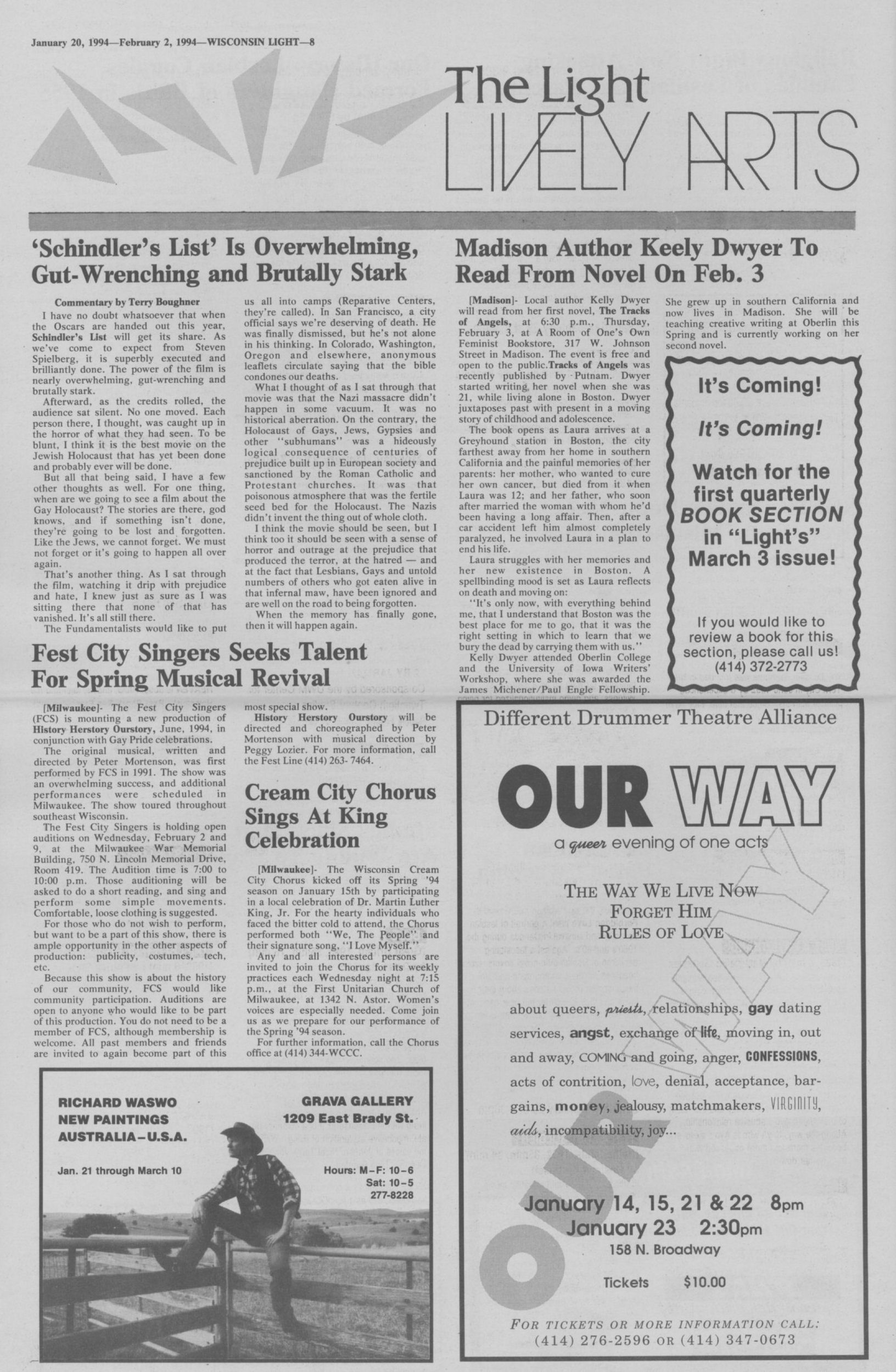 The Lively Arts: Fest City Singers seek talent for spring musical revival; Cream City Chorus to perform at Dr. Martin Luther King celebration; Madison author Keely Dwyer to read at A Room Of One's Own Feminist Bookstore