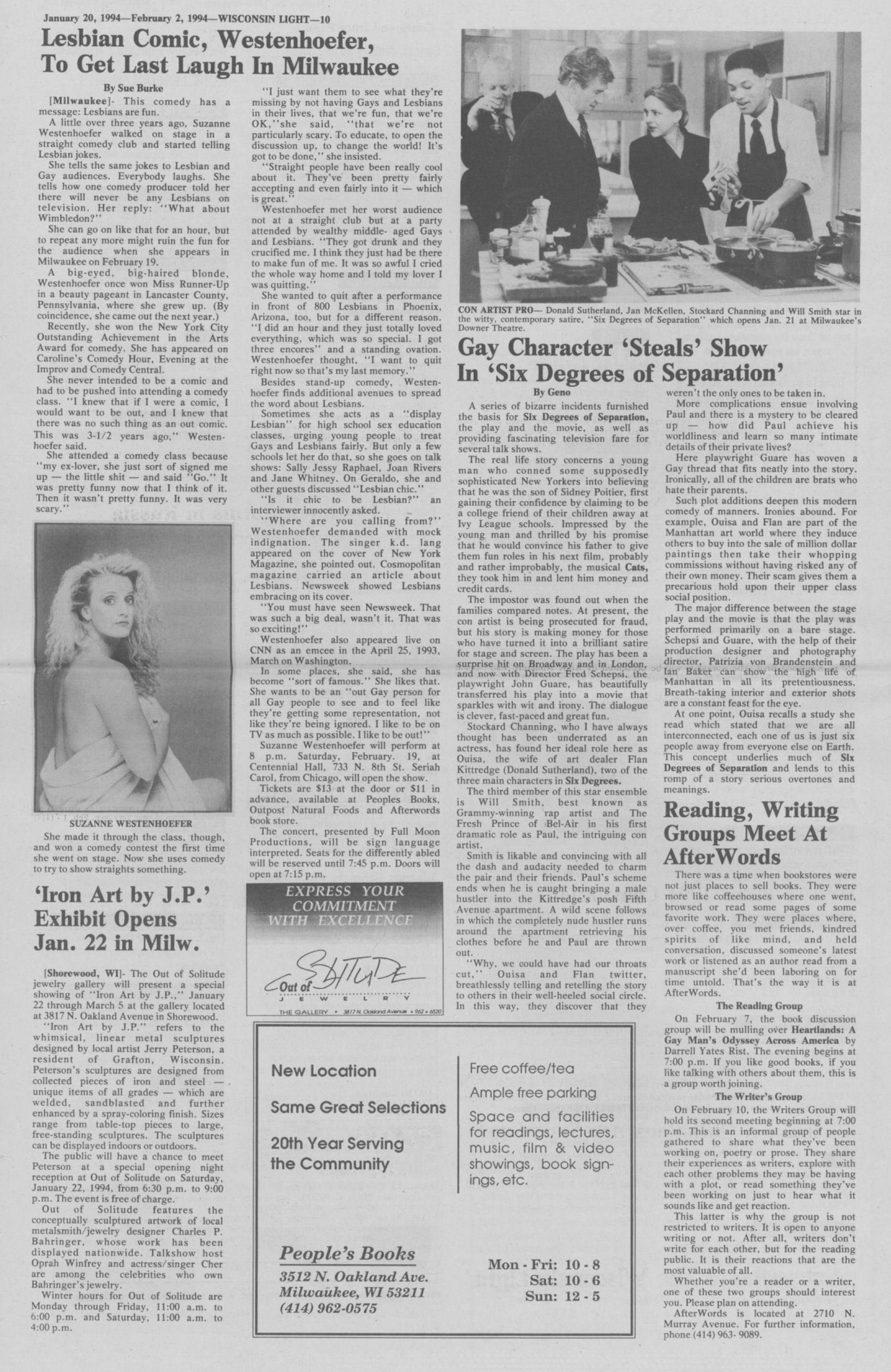 Lesbian comic Suzanne Westenhoefer to appear in Milwaukee February 19th; Reading and Writing groups meet at Milwaukee's AfterWords bookstore