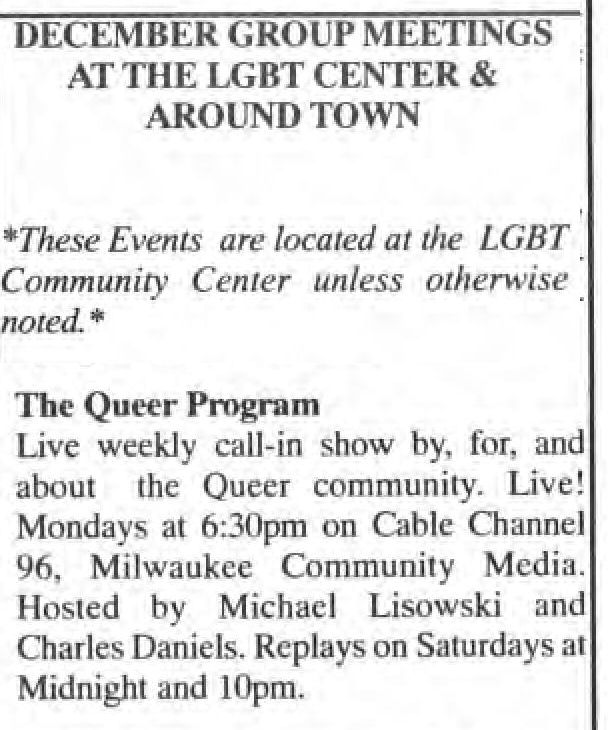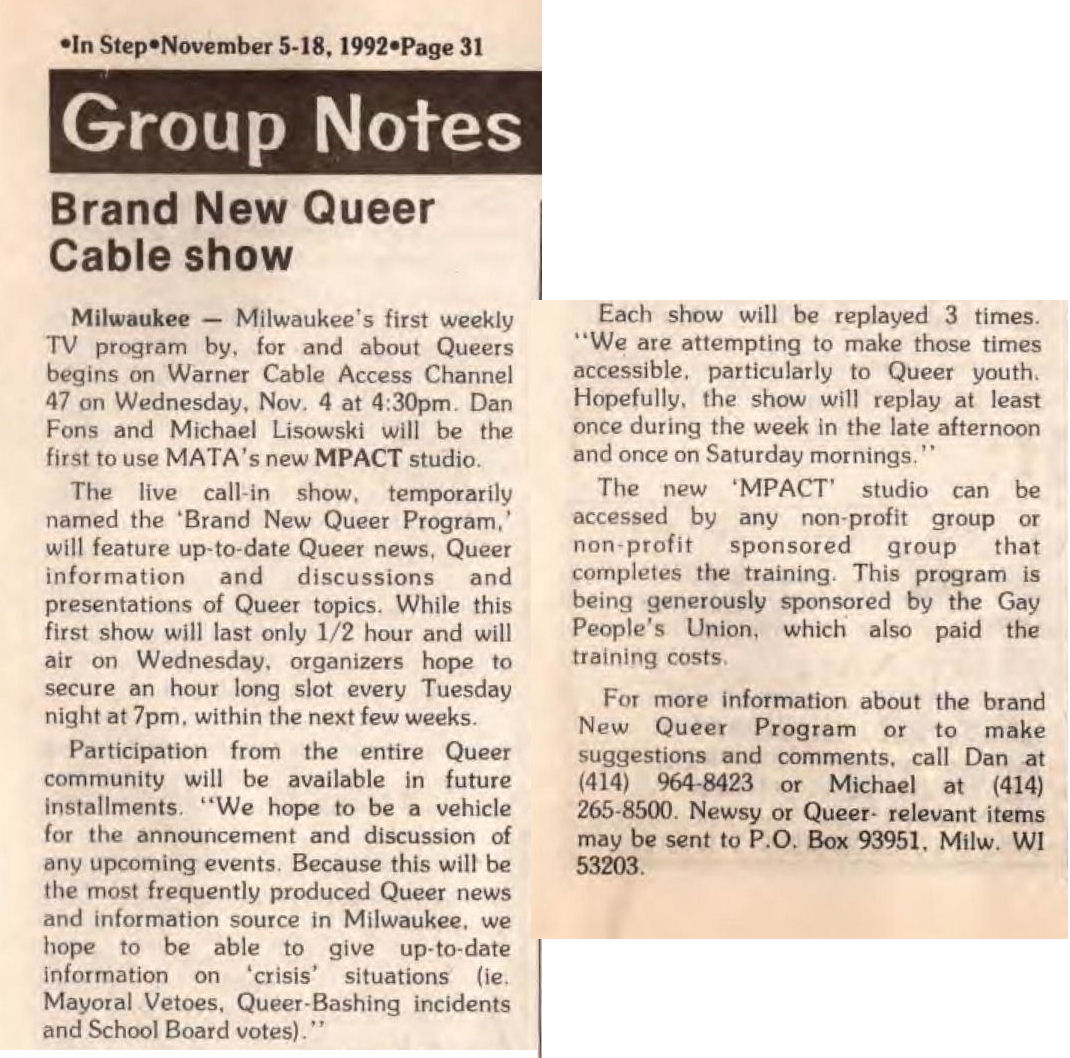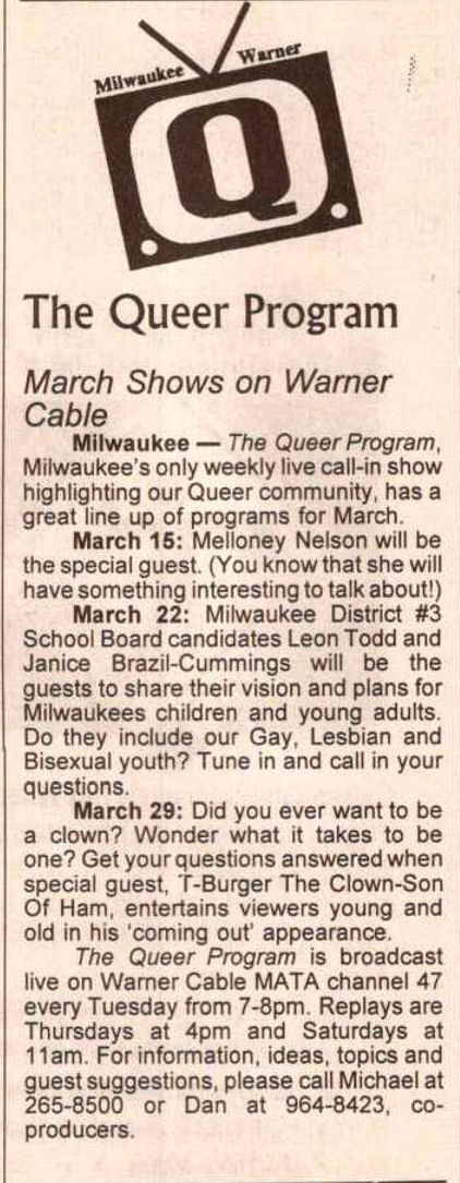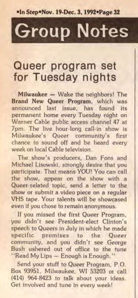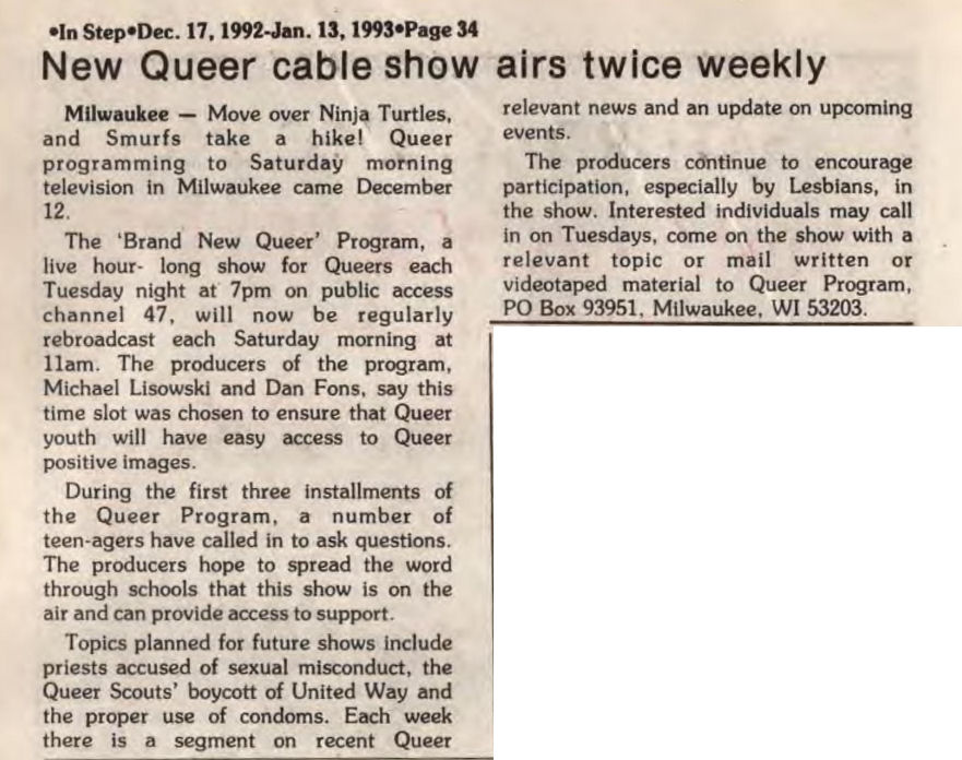 Michael Lisowski: The Dahmer case really cast the whole community in a negative light. I knew four of his victims - one was in the Milwaukee gay youth group. Lots of people knew them. Dahmer himself was a familiar face in the bars and the rumors were flying. Dan Fons was active in ACT-Up and we both worked for ARCW (AIDS Resource Center of Wisconsin.) We wanted a new means of communicating our side of things. We decided to create a Cable TV program and call it The Queer Program.