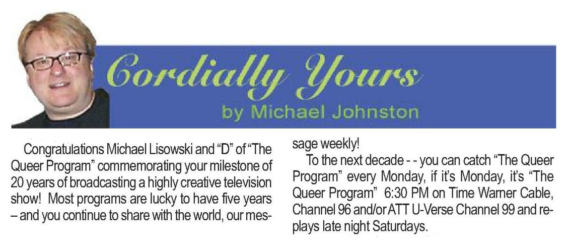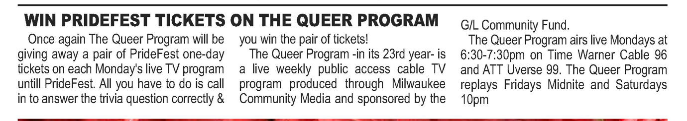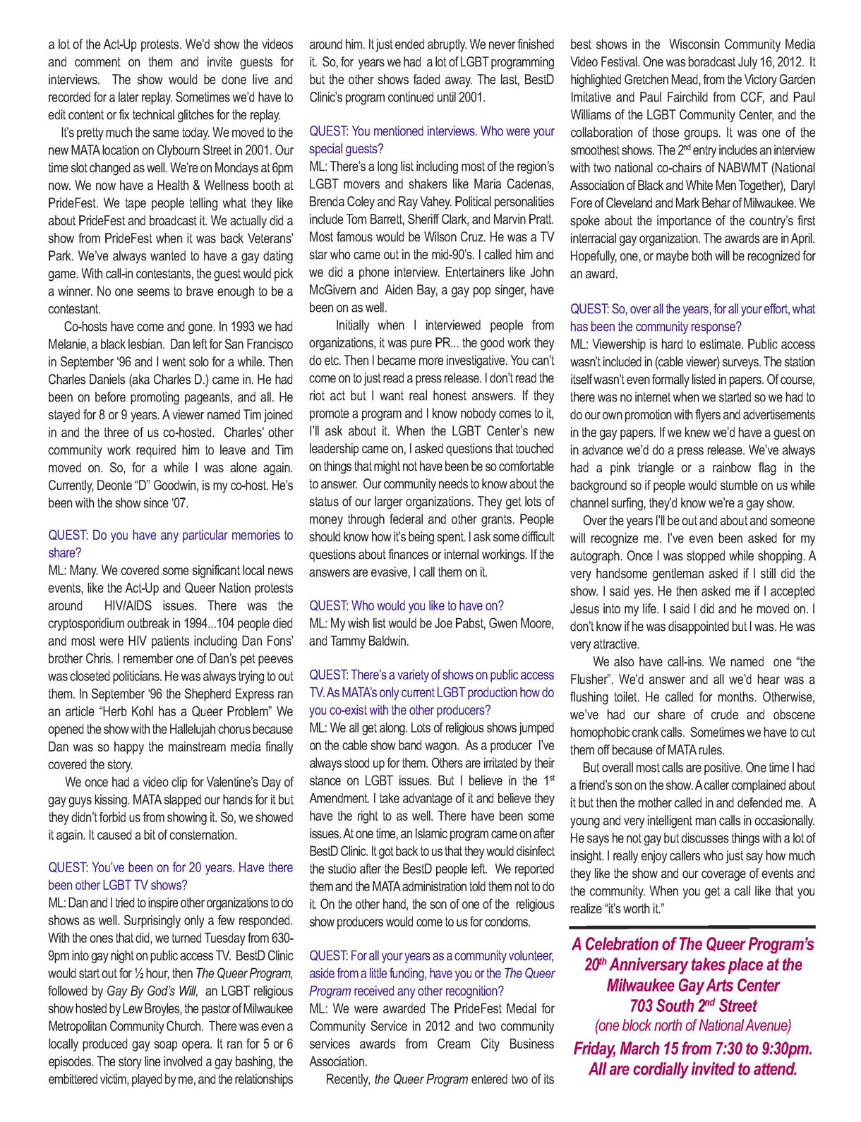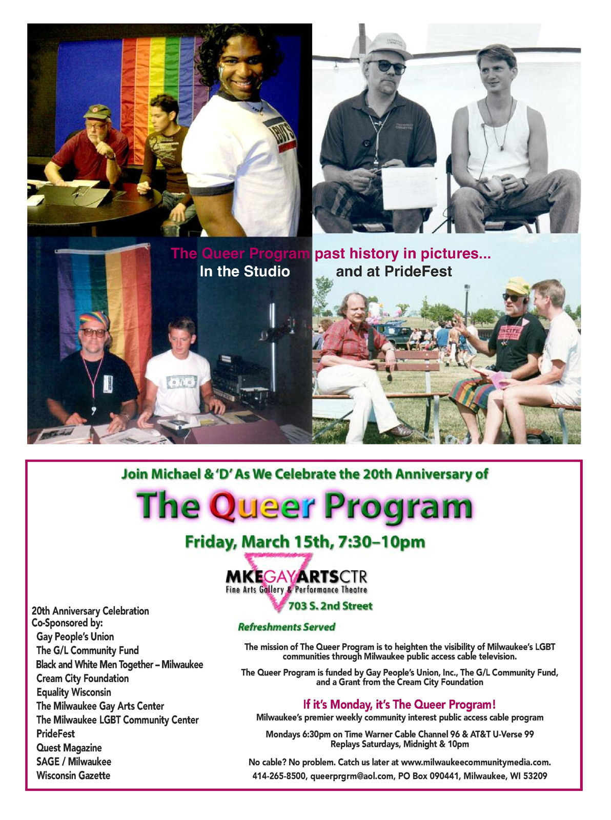 A Celebration of The Queer Program's 20th Anniversary takes place at the Milwaukee Gay Arts Center 703 South 2nd Street (one block north of National Avenue) Friday, March 15 from 7:30 to 9:30pm. All are cordially invited to attend.