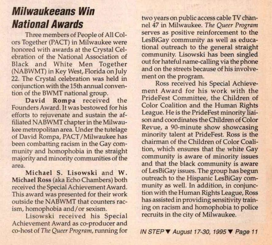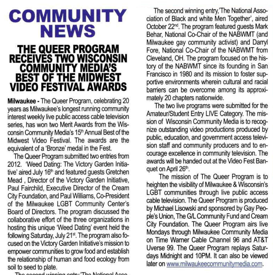 In May 2013, the Wisconsin Community Media's 15th Annual 'Best of the Midwest Video Festival' awarded two Merit awards to The Queer Program for two 2012 programs. The first was for the July 16, 2012 program "Weed Dating: The Victory Garden Initiative", featuring guests Gretchen Mead, Director of Victory Garden Initiative, Paul Fairchild, Executive Director of Cream City Foundation, and Paul Williams, Co-President of the Milw. LGBT Community Center's Board of Directors. The second winning entry was for the October 22, 2012 program "The National Association of Black and White Men Together", featuring guests Mark Behar, National Chair of the NABWMT, Milw. LGBT activist, and Darryl Fore, National Co-Chair of the NABWMT, from Cleveland, OH.