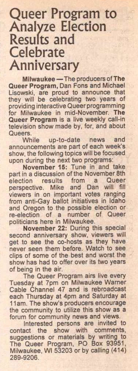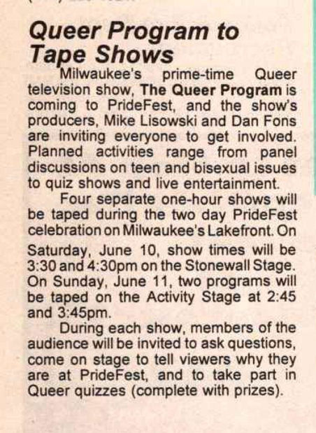 ML: Many. We covered some significant local news events, like the Act-Up and Queer Nation protests around HIV/AIDS issues. There was the cryptosporidium outbreak in 1994...104 people died and most were HIV patients including Dan Fons' brother Chris. I remember one of Dan's pet peeves was closeted politicians. He was always trying to out them. In September '96 the Shepherd Express ran an article "Herb Kohl has a Queer Problem" We opened the show with the Hallelujah chorus because Dan was so happy the mainstream media finally covered the story.