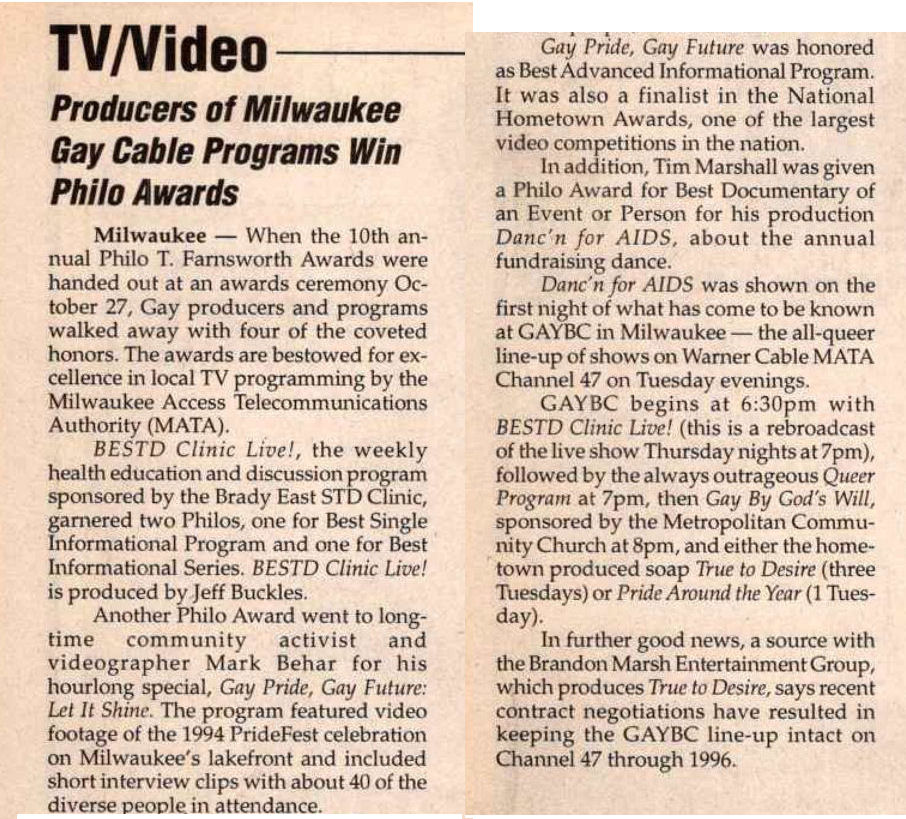 ML: Dan and I tried to inspire other organizations to do shows as well. Surprisingly only a few responded. With the ones that did, we turned Tuesday from 630- 9pm into gay night on public access TV. BestD Clinic would start out for 1/2 hour, then The Queer Program, followed by Gay By God's Will, an LGBT religious show hosted by Lew Broyles, the pastor of Milwaukee Metropolitan Community Church. There was even a locally produced gay soap opera. It ran for 5 or 6 episodes. The story line involved a gay bashing, the embittered victim, played by me, and the relationships around him. It just ended abruptly. We never finished it. So, for years we had a lot of LGBT programming but the other shows faded away. The last, BestD Clinic's program continued until 2001.