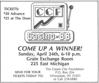 CCF sponsored the first Casino Nights based on a stellar event, "22 On The Red", run annually by San Francisco's foundation and witnessed by President Don Schwamb on a visit there in 1986. The first two events were held in the elegant Grain Exchange Room in spring of 1987 and 1988, and were extremely popular events. With declining revenues, the event was relocated to the War Memorial Center for 1989.