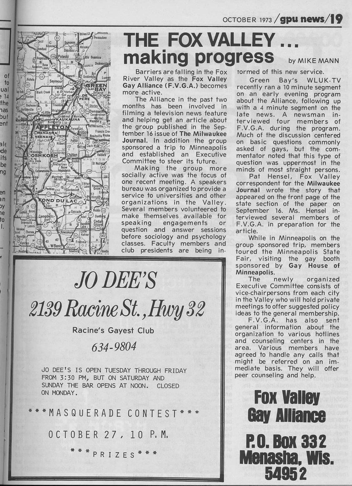 On November 30, 1972, during a dinner party at a home in Neenah, discussions ensued regarding the possibility of forming a gay and lesbian group or organization for the Oshkosh-to-Appleton area. There were six men at that dinner party who agreed to speak with their gay and lesbian friends about this subject. A week later, on December 6, an organizational group of twenty gays and lesbians met at the Conway Hotel bar in Appleton. There were subsequent meetings on December 12th, 19th and 27th at various locations. A post office box was rented and notices were posted at UW-Oshkosh, Lawrence University and UW-Stevens Point. The group called itself the Fox Valley Gay Alliance (FVGA). Meetings were held every other Tuesday during 1973. Gays and lesbians attended from as far away as Fond du Lac, Green Bay, Manitowoc and Wausau. Most meetings had forty to fifty people in attendance and were held in members’ homes. The first official FVGA event was a Mardi Gras party held at a member’s home in Neenah with fifty-two people in costume. Other events/parties included a FVGA picnic in Menominee Park, Oshkosh, a Halloween party, and a Christmas gathering during 1973. During the following year, 1974, the primary discussion topic at most FVGA meetings was the search for a gay/lesbian-friendly bar in the Fox Valley area. The Conway Hotel bar and Cleo’s Brown Beam in Appleton and Mr. Luckys in Oshkosh were notorious as gay hangouts. Several attempts to make these, and a few other bars, openly “gay-friendly” were not successful. In October of 1974, after a FVGA meeting in downtown Appleton, a group of members walked into Doris’ Super Bar on College Avenue. Following a few discussions with owner, Doris, she was willing to give it a try. Doris’ became a very profitable gay/lesbian bar, and was subsequently sold to a gay couple and renamed the Lambda Lounge. Many FVGA meetings and parties were held at this establishment. FVGA meetings became less frequent in 1975. The main objective of the group had been met. The last FVGA gathering was a Mardi Gras held at the Lambda Lounge on February 29, 1975. |
