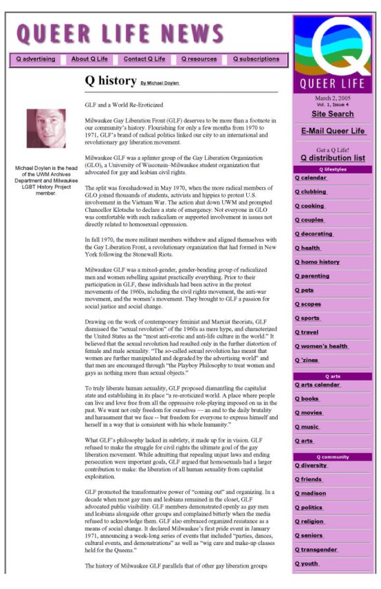 From the article "GLF and a World Re-Eroticized" in the March 2005 issue of Q Life Newspaper; written by Michael Doylen, head of the UWM Archives Department and a member of the Milwaukee LGBT History Project.: Milwaukee Gay Liberation Front (GLF) deserves to be more than a footnote in our community’s history. Flourishing for only a few months from 1970 to 1971, GLF’s brand of radical politics linked our city to an international and revolutionary gay liberation movement. Milwaukee GLF was a splinter group of the Gay Liberation Organization (GLO), a University of Wisconsin–Milwaukee student organization that advocated for gay and lesbian civil rights. The split was foreshadowed in May 1970, when the more radical members of GLO joined thousands of students, activists and hippies to protest U.S. involvement in the Vietnam War. The action shut down UWM and prompted Chancellor Klotsche to declare a state of emergency. Not everyone in GLO was comfortable with such radicalism or supported involvement in issues not directly related to homosexual oppression. In fall 1970, the more militant members withdrew and aligned themselves with the Gay Liberation Front, a revolutionary organization that had formed in New York following the Stonewall Riots. Milwaukee GLF was a mixed-gender, gender-bending group of radicalized men and women rebelling against practically everything. Prior to their participation in GLF, these individuals had been active in the protest movements of the 1960s, including the civil rights movement, the anti-war movement, and the women’s movement. They brought to GLF a passion for social justice and social change. Drawing on the work of contemporary feminist and Marxist theorists, GLF dismissed the “sexual revolution” of the 1960s as mere hype, and characterized the United States as the “most anti-erotic and anti-life culture in the world.” It believed that the sexual revolution had resulted only in the further distortion of female and male sexuality. “The so-called sexual revolution has meant that women are further manipulated and degraded by the advertising world” and that men are encouraged through “the Playboy Philosophy to treat women and gays as nothing more than sexual objects.” To truly liberate human sexuality, GLF proposed dismantling the capitalist state and establishing in its place “a re-eroticized world. A place where people can live and love free from all the oppressive role-playing imposed on us in the past. We want not only freedom for ourselves — an end to the daily brutality and harassment that we face -- but freedom for everyone to express himself and herself in a way that is consistent with his whole humanity.” What GLF’s philosophy lacked in subtlety, it made up for in vision. GLF refused to make the struggle for civil rights the ultimate goal of the gay liberation movement. While admitting that repealing unjust laws and ending persecution were important goals, GLF argued that homosexuals had a larger contribution to make: the liberation of all human sexuality from capitalist exploitation. GLF promoted the transformative power of “coming out” and organizing. In a decade when most gay men and lesbians remained in the closet, GLF advocated public visibility. GLF members demonstrated openly as gay men and lesbians alongside other groups and complained bitterly when the media refused to acknowledge them. GLF also embraced organized resistance as a means of social change. It declared Milwaukee’s first pride event in January 1971, announcing a week-long series of events that included “parties, dances, cultural events, and demonstrations” as well as “wig care and make-up classes held for the Queens.” The history of Milwaukee GLF parallels that of other gay liberation groups across the country. By 1972, the brand of radical politics practiced by GLF was already waning. Nationally, the activist style of gay liberation was being replaced by the more moderate politics of the gay and lesbian rights movement. Acceptance into mainstream American society replaced revolution as a political goal. Does the eclipse of the gay liberation movement make GLF historically irrelevant? Hardly. GLF and gay liberation left an important legacy, one in which “coming out” is charged with political meaning and “pride” represents a new possibility for self-understanding. In GLF’s radical politics -- its insistence that the struggle for civil rights is not the final aim of sexual liberation -- we may also find a legacy yet to be realized. |