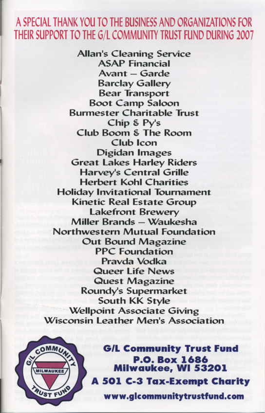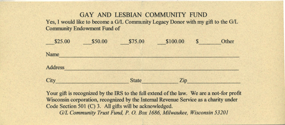 Originally founded in 1995 as G/L Community Center Trust Fund, this organization was at one time intended to help lead to a Community Center for Milwaukee's LGBT community. Their web site at that time stated "The G/L Community Center and Community Trust Fund was established in 1995 from the settlement of the Beer Town Badgers Inc. It was established to maintain a community center for the public to have a general meeting place for gays, lesbians, and other organization in need of meeting place facilities." Once such a center became a reality, the organization rebranded itself as simply the G/L Community Fund and supports various smaller organizations in the community from small individual donations.