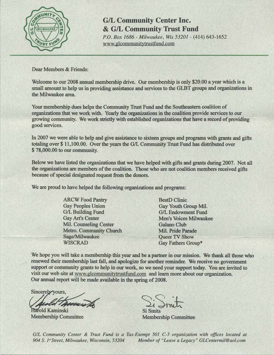 NOTE: A "Donald Schwamb" is listed by this group as a member of their Board of Directors. This is NOT the same person as the Don Schwamb who runs this History Project website. The Don Schwamb who runs this web site has been a Past President of GAMMA, founding Vice President of the ARCW, long-time President of the Cream City Foundation, and numerous other involvements. The "Donald Schwamb" who is a member of the Board of Directors of this group, the G/L Community Fund, has no known affiliation with any of those other organizations, and has no involvement with this website.